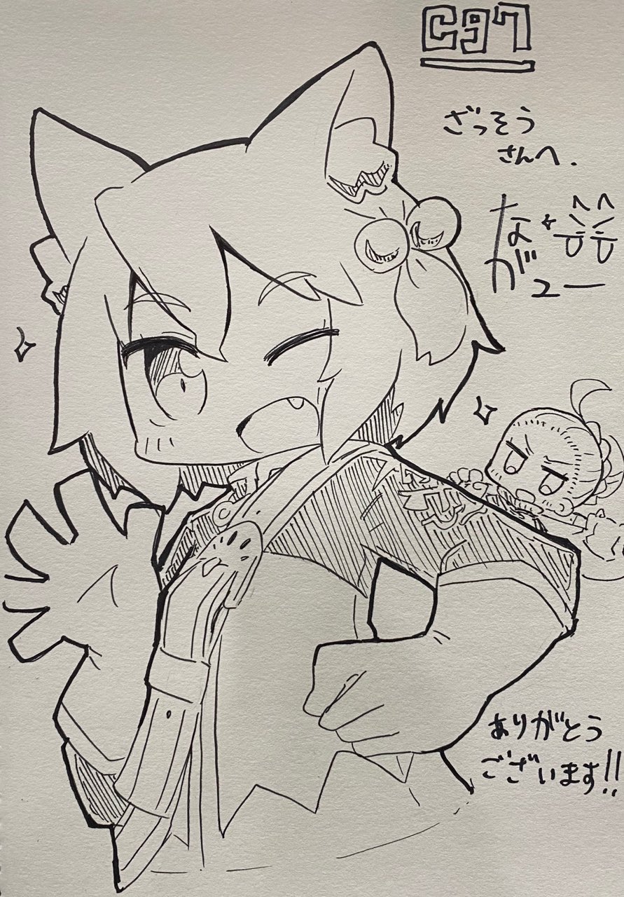 2girls 7th_dragon 7th_dragon_(series) :d ahoge animal_ear_fluff animal_ears fang fighter_(7th_dragon) gloves hair_ornament harukara_(7th_dragon) highres jacket long_hair looking_at_viewer moiko_(7th_dragon) monochrome multiple_girls one_eye_closed open_mouth short_hair smile traditional_media upper_body zassou
