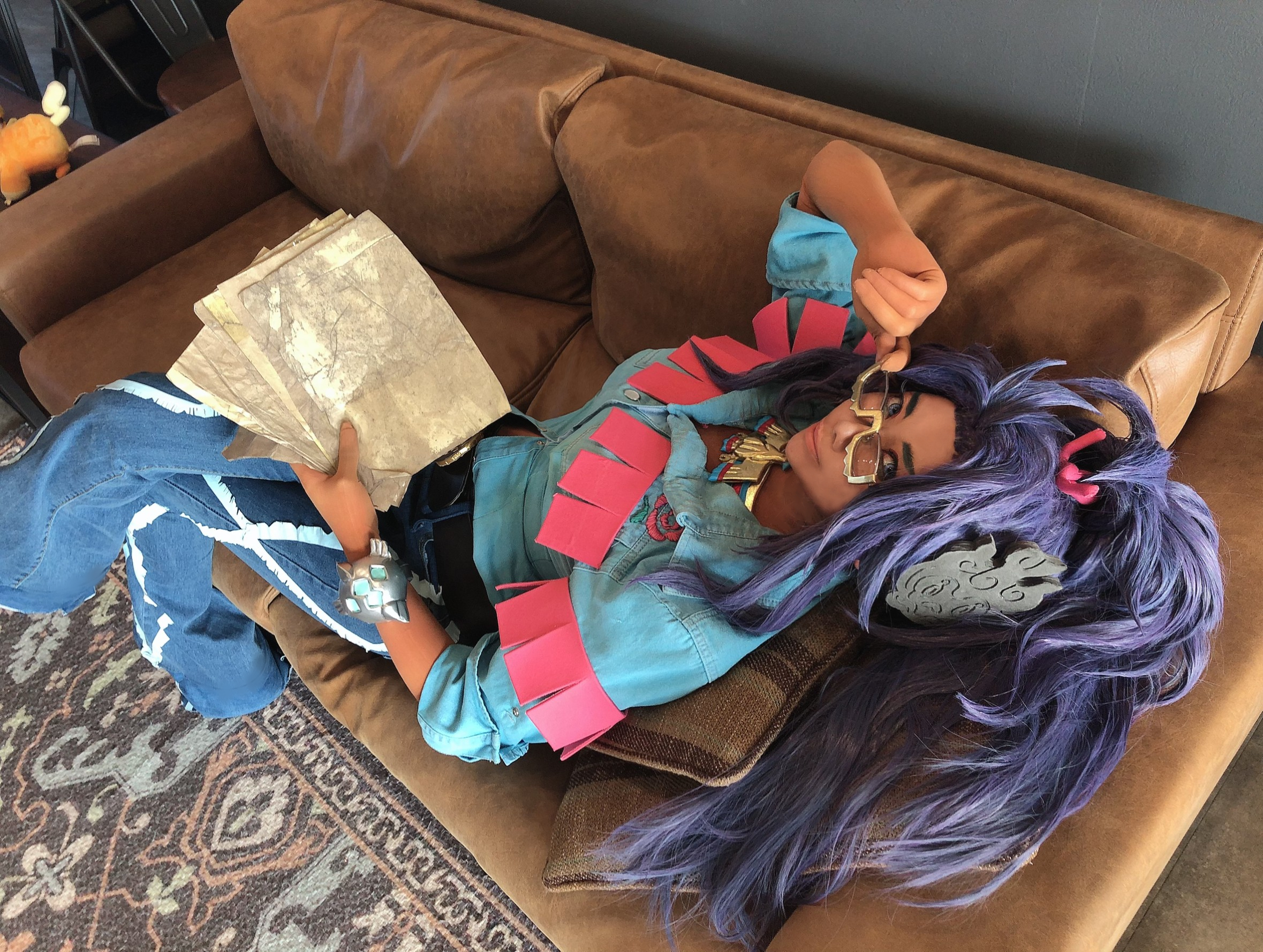1girl cosplay crossed_legs denim glasses hair_ornament high_ponytail highres japanese_(nationality) jewelry lips long_hair lying model_request nintendo pants photo_(medium) pokemon pokemon_sv ponytail purple_eyes raifort_(pokemon) raifort_(pokemon)_(cosplay) real_life semi-rimless_eyewear shirt sidelocks smile solo standing very_long_hair