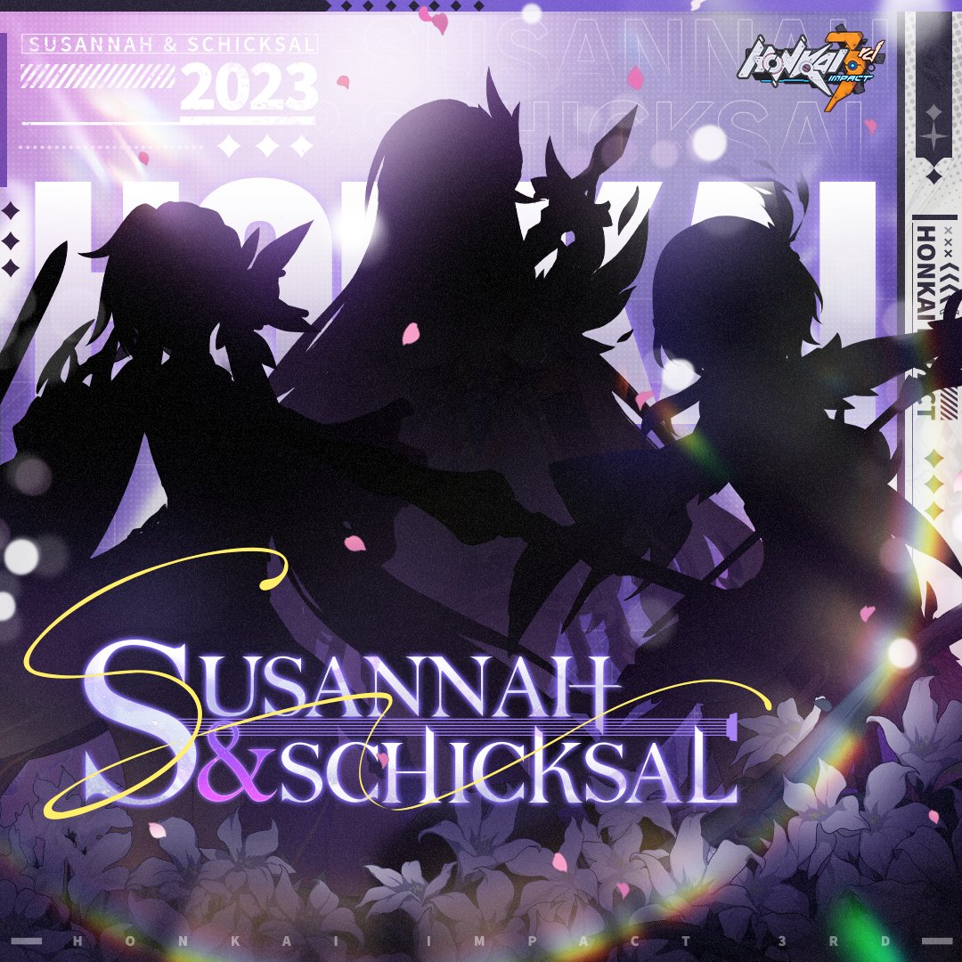 2023 3girls april_fools durandal_(honkai_impact) character_name commentary durandal_(palatinus_equinox)_(honkai_impact) english_commentary english_text flower honkai_(series) honkai_impact_3rd li_sushang li_sushang_(jade_knight) logo long_hair multiple_girls official_art rita_rossweisse rita_rossweisse_(spina_astera) short_hair sword upper_body weapon white_flower