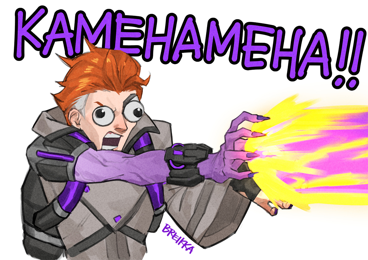 ! !! 1girl artist_name breikka coat commentary dragon_ball dragonball_z english_commentary googly_eyes incoming_attack kamehameha_(dragon_ball) long_sleeves moira_(overwatch) multicolored_hair nail_polish open_mouth orange_hair overwatch overwatch_2 purple_nails short_hair simple_background solo streaked_hair teeth v-shaped_eyebrows veins white_background