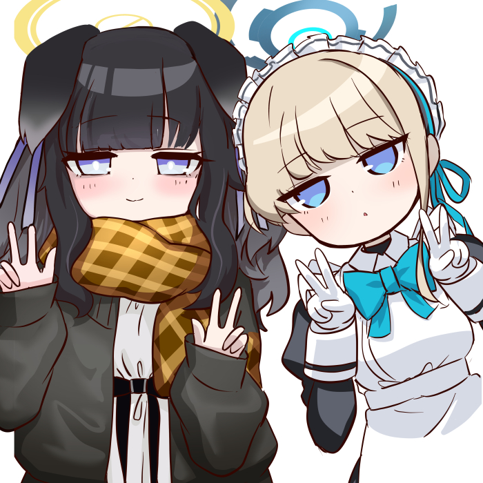 2girls alternate_costume animal_ears apron black_coat black_hair blue_archive blue_bow blue_bowtie blue_eyes blunt_bangs bow bowtie casual coat commentary_request dog_ears dog_girl double_v expressionless gloves grey_eyes halo hibiki_(blue_archive) light_brown_hair long_hair long_sleeves looking_at_viewer maid maid_apron maid_headdress multiple_girls open_clothes open_coat plaid_clothes plaid_scarf scarf shooka sidelocks simple_background smile toki_(blue_archive) v white_background white_gloves