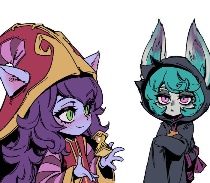 2girls black_hoodie colored_skin cowboy_shot ears_through_headwear green_eyes green_hair holding hood hoodie jacket league_of_legends long_sleeves lulu_(league_of_legends) multiple_girls phantom_cross pink_eyes purple_hair purple_skin red_headwear red_jacket short_hair simple_background smile striped_sleeves very_long_sleeves vex_(league_of_legends) white_background zhonya's_hourglass