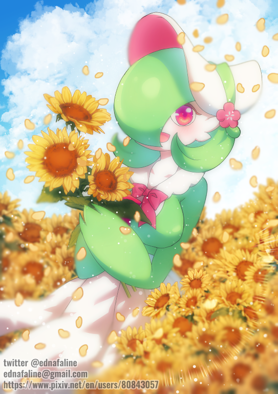 1girl artist_name blue_sky blurry blush bob_cut bonnet bow bowtie breasts capelet cloud colored_skin day depth_of_field dutch_angle edna_faline email_address female_focus flower gardevoir gardevoir_(fashionable) gen_3_pokemon green_hair green_skin hair_over_one_eye hands_up happy holding holding_flower looking_at_viewer medium_breasts multicolored_skin nintendo one_eye_covered open_mouth outdoors own_hands_together petals pink_bow pink_bowtie pixiv_id pokemon pokemon_(creature) pokemon_unite red_eyes short_hair sky smile solo standing sunflower twitter_username two-tone_skin watermark web_address white_bonnet white_capelet white_headwear white_skin yellow_flower