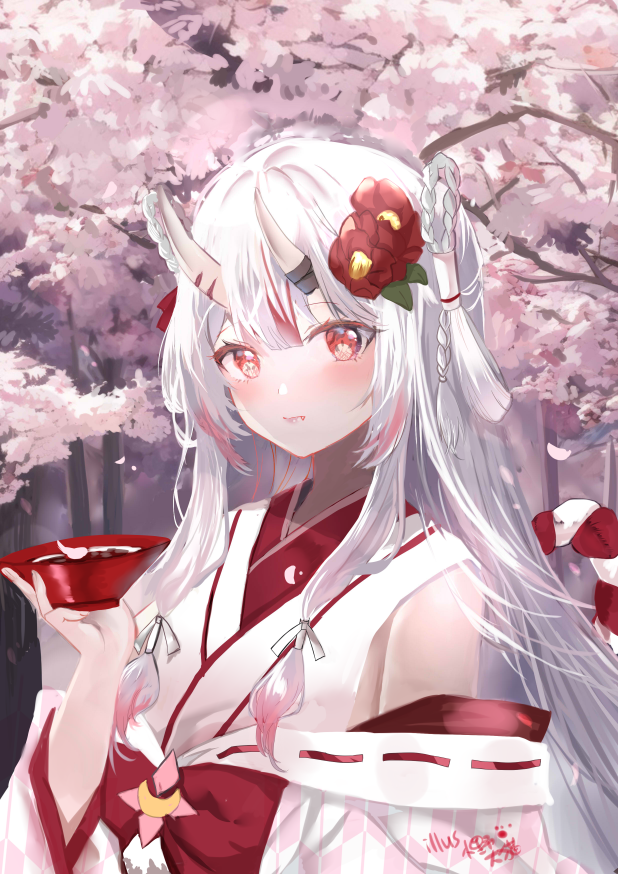 1girl bare_shoulders closed_mouth commentary_request fang fang_out flower hair_between_eyes hair_flower hair_ornament hand_up holding hololive horns japanese_clothes kimono long_hair long_sleeves looking_at_viewer lunacats multicolored_hair nakiri_ayame nakiri_ayame_(shrine_maiden) off_shoulder oni petals red_eyes red_flower red_hair signature skin-covered_horns solo streaked_hair tree upper_body very_long_hair virtual_youtuber white_hair white_kimono wide_sleeves