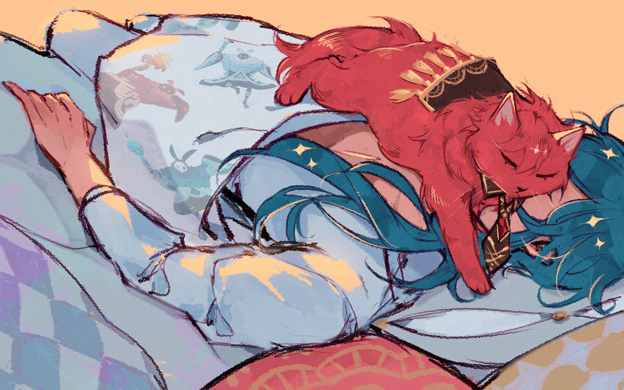 2boys blue_hair blue_pajamas brown_cape brown_necktie cape closed_eyes dark-skinned_male dark_skin diluc_(cat)_(genshin_impact) diluc_(genshin_impact) genshin_impact gi_de_off highres kaeya_(genshin_impact) long_hair long_sleeves male_focus multiple_boys necktie pajamas pillow red_cat under_covers yellow_background