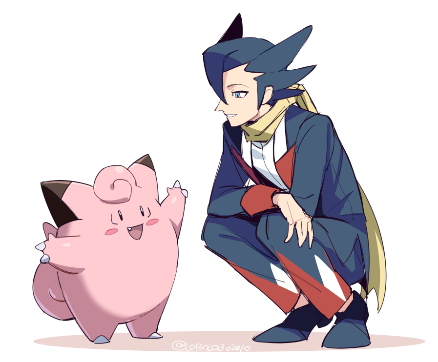 1boy black_footwear black_hair black_jacket black_pants blue_eyes clefairy commentary_request gen_1_pokemon grimsley_(pokemon) jacket long_sleeves looking_down male_focus momoji_(lobolobo2010) nintendo pants parted_lips pointy_hair pokemon pokemon_(creature) pokemon_black_and_white scarf shirt shoes smile squatting twitter_username watermark white_background white_shirt yellow_scarf