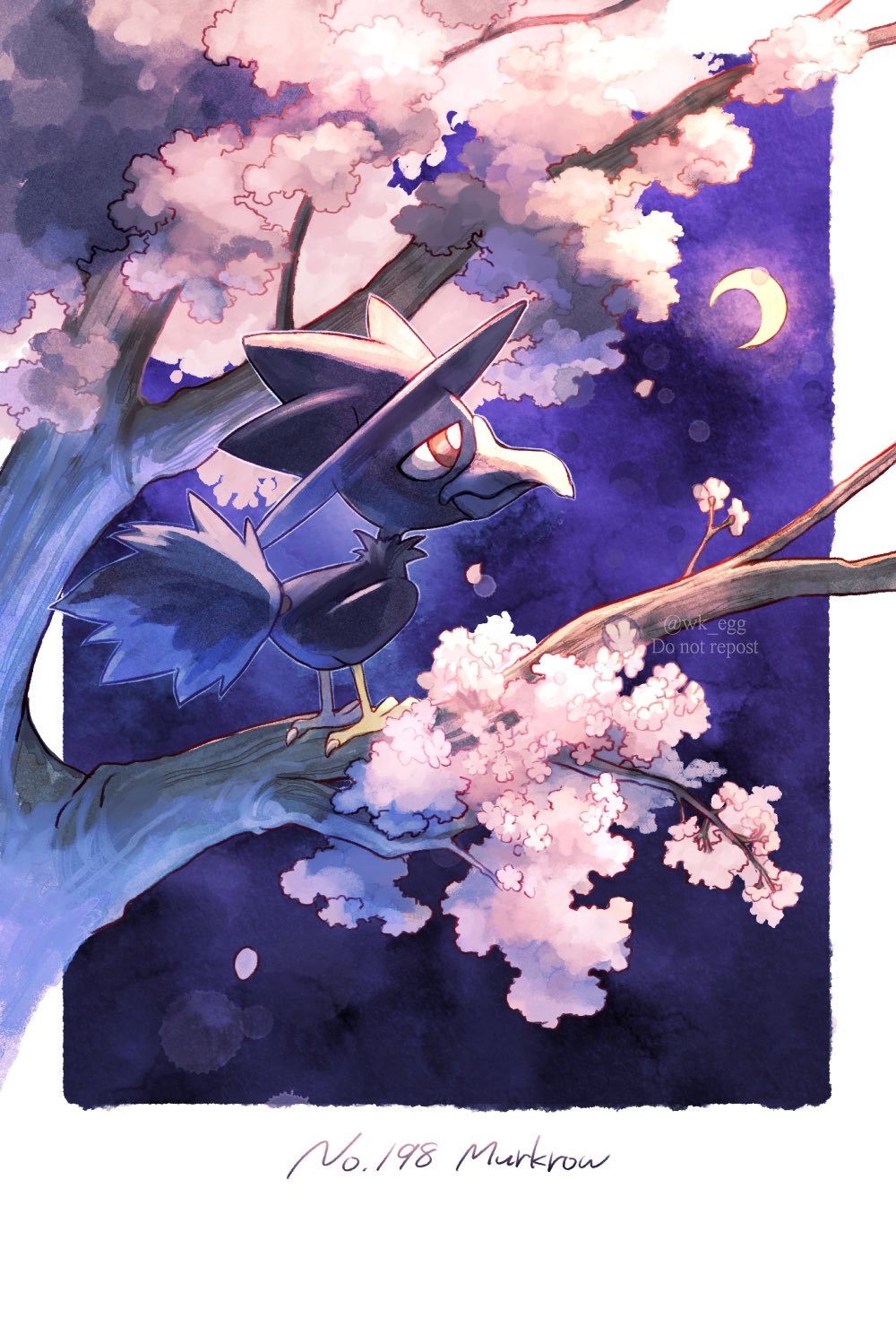 bird character_name commentary_request crescent_moon eko_(wk_egg) gen_2_pokemon highres moon murkrow night nintendo no_humans outdoors pokedex_number pokemon pokemon_(creature) sky solo standing tree twitter_username watermark