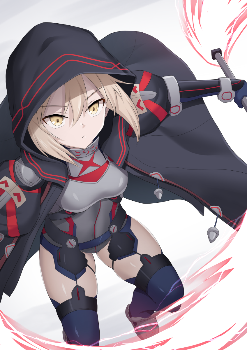1girl armor artoria_pendragon_(fate) black_hood blonde_hair blue_thighhighs breastplate cross_(crossryou) double_blade energy_sword fate/grand_order fate_(series) gloves glowing glowing_weapon grey_leotard hair_between_eyes highres holding holding_sword holding_weapon hood hood_up jacket leotard lightsaber looking_at_viewer mysterious_heroine_x_alter_(fate) mysterious_heroine_x_alter_(third_ascension)_(fate) saberstaff short_hair sidelocks solo sword thighhighs weapon yellow_eyes