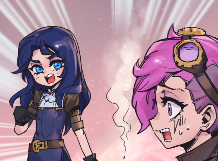 2girls belt black_gloves black_hair blue_eyes blush brown_belt caitlyn_(league_of_legends) flat_chest gloves goggles goggles_on_head hand_up league_of_legends long_hair multiple_girls open_mouth phantom_cross pink_hair profile short_hair short_sleeves smoke sweat teeth tongue upper_teeth_only vi_(league_of_legends)