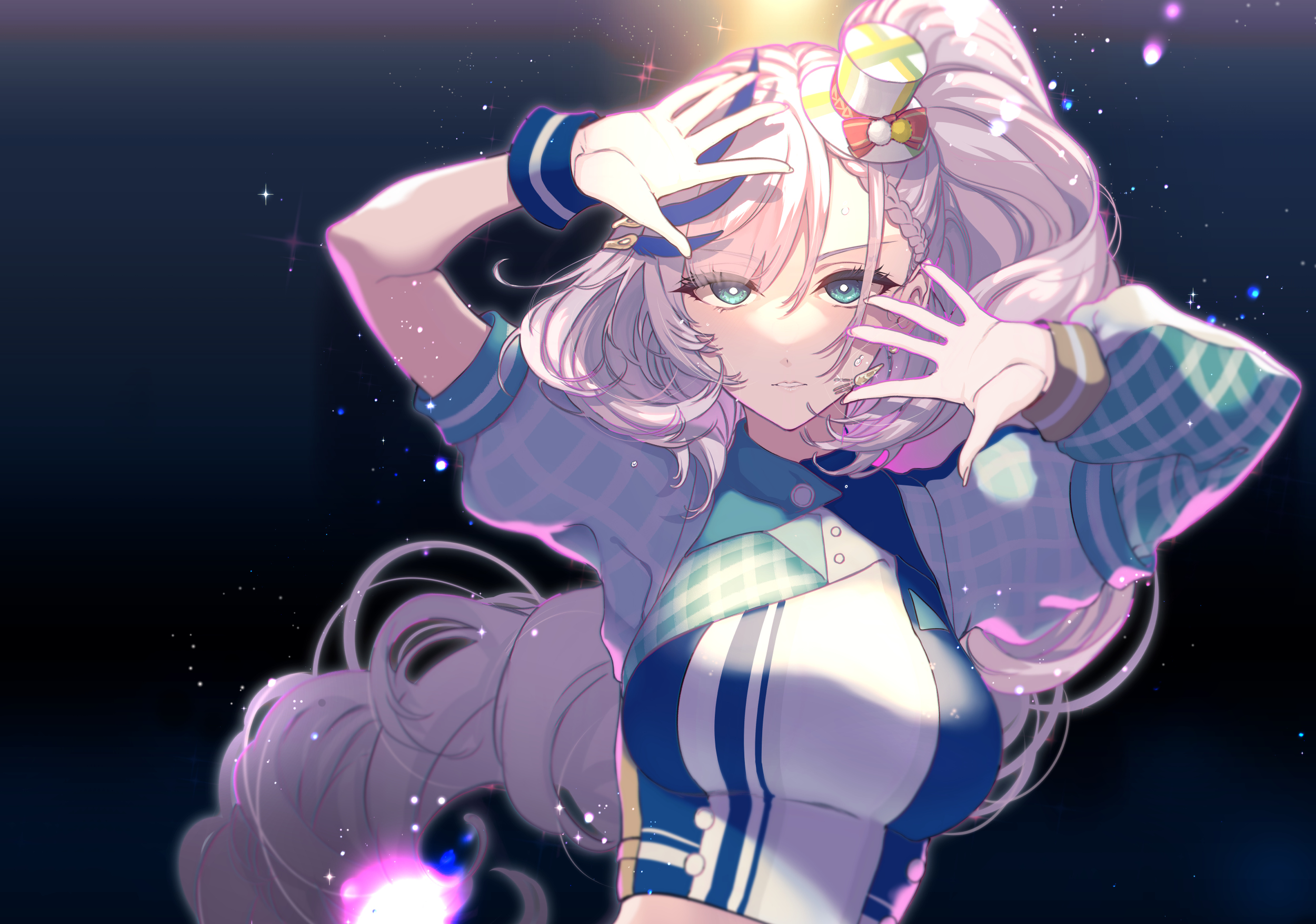 1girl asymmetrical_sleeves blue_eyes braid breasts bright_pupils feather_hair_ornament feathers french_braid hair_ornament hat highres hololive hololive_idol_uniform_(bright) hololive_indonesia large_breasts long_hair mini_hat mismatched_sleeves pavolia_reine pochi_(pochi-goya) ponytail single_wrist_cuff solo virtual_youtuber wavy_hair white_hair white_pupils wrist_cuffs