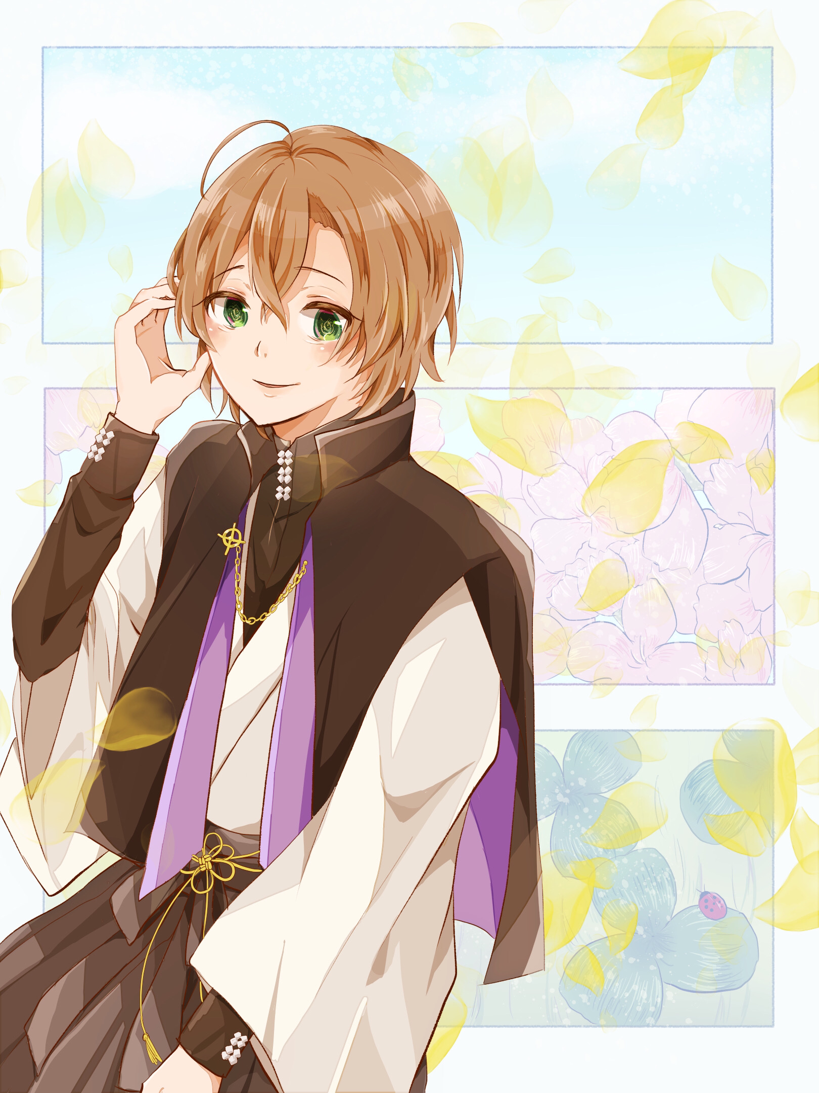 1boy ahoge black_cape black_shirt blue_flower cape celtic_cross chain collared_cape collared_shirt cross double-parted_bangs floral_background flower gold_chain green_eyes grey_hakama hair_between_eyes hakama hand_on_own_head hand_up highres hypnosis_mic japanese_clothes kimono layered_sleeves blue_background long_sleeves male_focus multicolored_background pam_kya paneled_background parted_lips petals pink_flower purple_cape ribbon shirt short_hair smile solo turtleneck two-sided_cape two-sided_fabric two-tone_cape upper_body white_background white_kimono wide_sleeves yellow_ribbon yumeno_gentaro