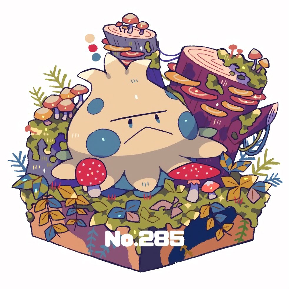 :< closed_mouth color_guide commentary_request faux_figurine fly_agaric frown gen_3_pokemon grass leaf moss mushroom nintendo no_humans plant pokedex_number pokemon pokemon_(creature) shino_(shinoru_p) shroomish simple_background solo tree_stump white_background