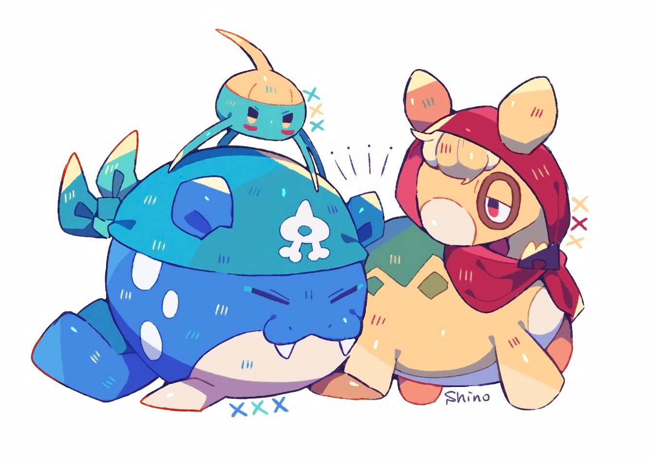 :3 artist_name bandana blue_bandana cloak closed_eyes closed_mouth color_guide commentary_request fangs gen_3_pokemon hood hood_up hooded_cloak looking_at_another looking_back nintendo no_humans notice_lines numel on_head pokemon pokemon_(creature) pokemon_on_head red_cloak red_eyes shino_(shinoru_p) simple_background smile spheal surskit team_aqua team_magma v-shaped_eyebrows white_background