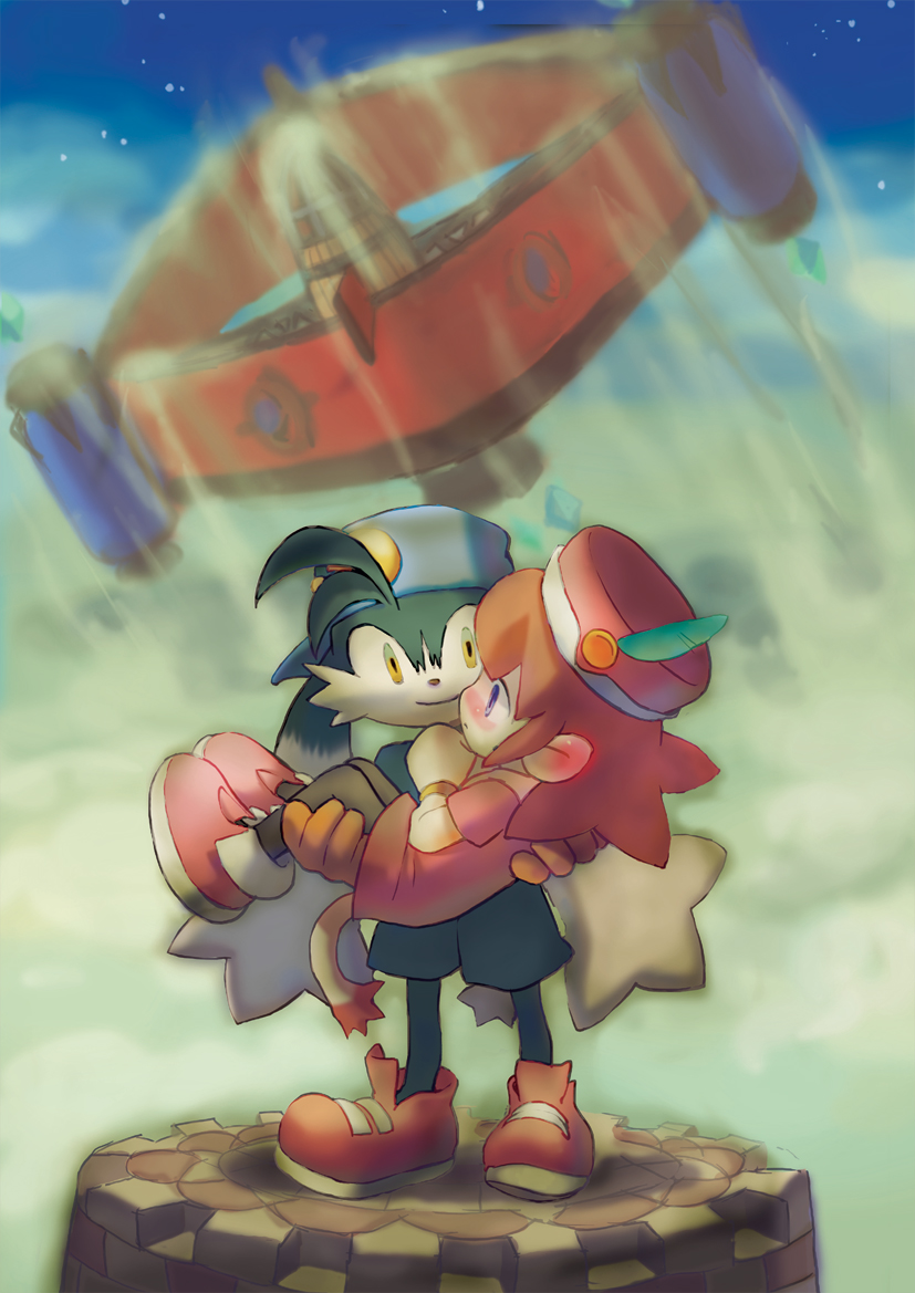 1boy 1girl animal_ears blue_eyes blue_headwear blue_sky blush brown_hair carrying dress furry furry_female furry_male gloves izuo kaze_no_klonoa klonoa lolo_(klonoa) looking_at_another monkey_ears monkey_tail pink_dress pink_headwear pink_shoes princess_carry shoes sky tail yellow_eyes yellow_gloves