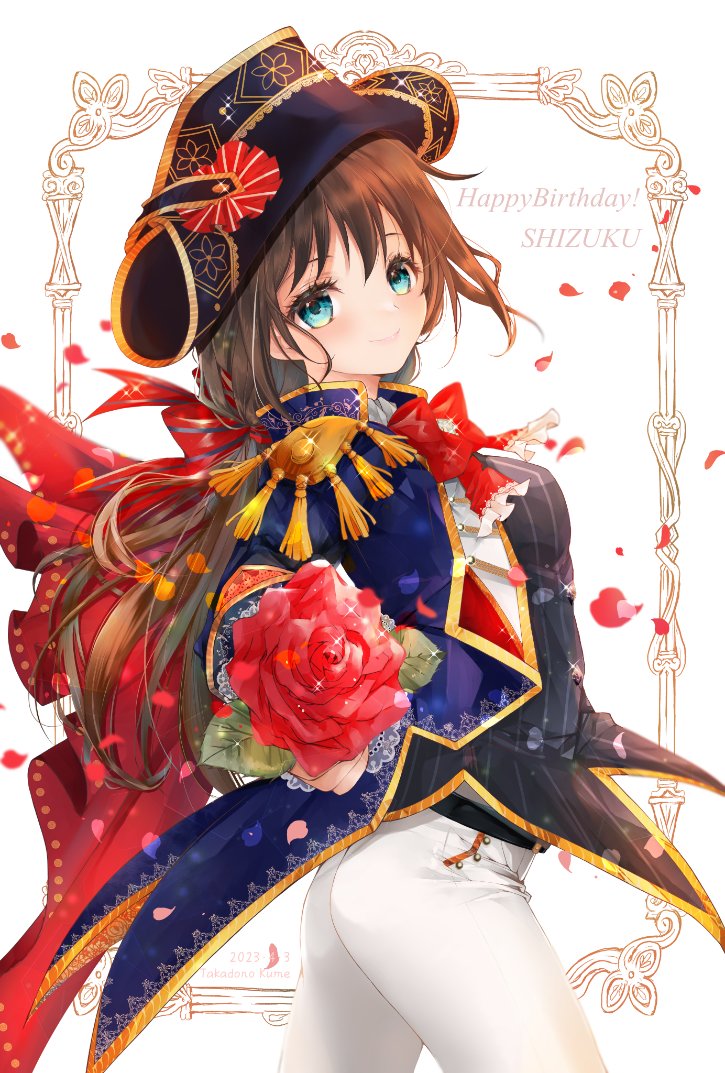 1girl artist_name belt bicorne black_belt blue_coat blue_eyes bow brown_hair cape coat epaulettes flower hair_bow happy_birthday hat love_live! love_live!_nijigasaki_high_school_idol_club love_live!_school_idol_festival_all_stars military military_uniform osaka_shizuku osaka_shizuku_(rose_knight) pants petals ponytail red_bow red_cape red_flower red_rose rose rose_petals solo striped_bow takadono_kume white_background white_pants