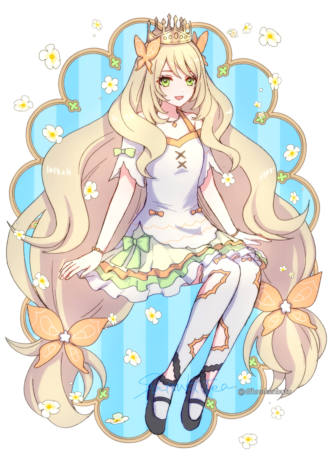 1girl :d black_footwear blonde_hair bow butterfly_hair_ornament celine_(fire_emblem) crown dfhnokenbutu dress fire_emblem fire_emblem_engage flower full_body green_bow green_eyes hair_ornament highres layered_skirt long_hair looking_at_viewer nintendo official_alternate_costume open_mouth orange_bow skirt smile solo thighhighs twitter_username very_long_hair white_dress white_thighhighs