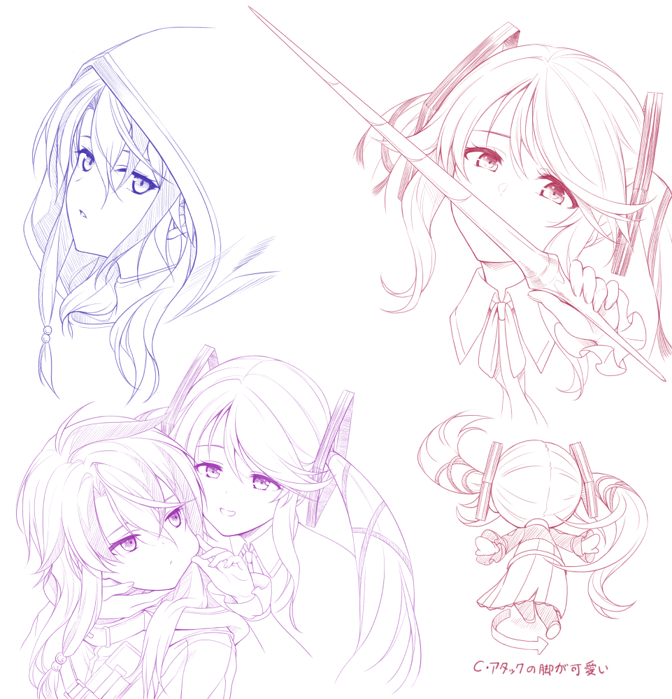 2girls arrow_(symbol) bow bowtie cheek_pinching chibi collared_shirt covered_mouth eiyuu_densetsu hair_bobbles hair_ornament hair_ribbon hajimari_no_kiseki hakuleg holding hood jorda_eldarion kuro_no_kiseki kuro_no_kiseki_(series) kuro_no_kiseki_i kuro_no_kiseki_ii monochrome multiple_girls multiple_views nadia_rayne parted_lips pinching pleated_skirt ribbon shirt skirt smile