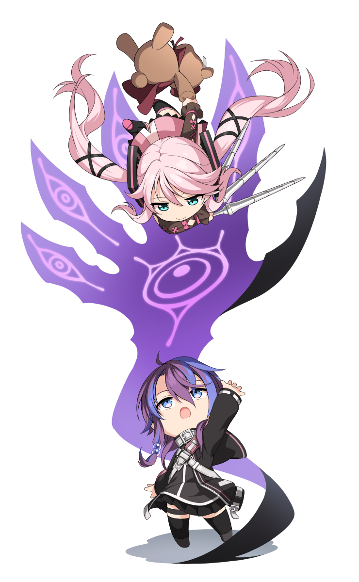 2girls :o belt belt_collar blue_eyes blue_hair chibi collar eiyuu_densetsu hair_bobbles hair_ornament hajimari_no_kiseki hakuleg highres jorda_eldarion kuro_no_kiseki kuro_no_kiseki_(series) kuro_no_kiseki_i kuro_no_kiseki_ii multicolored_hair multiple_girls nadia_rayne open_mouth outstretched_arm outstretched_hand pink_hair pleated_skirt purple_hair skirt smile streaked_hair stuffed_animal stuffed_toy teddy_bear thigh_strap thighhighs two-tone_hair