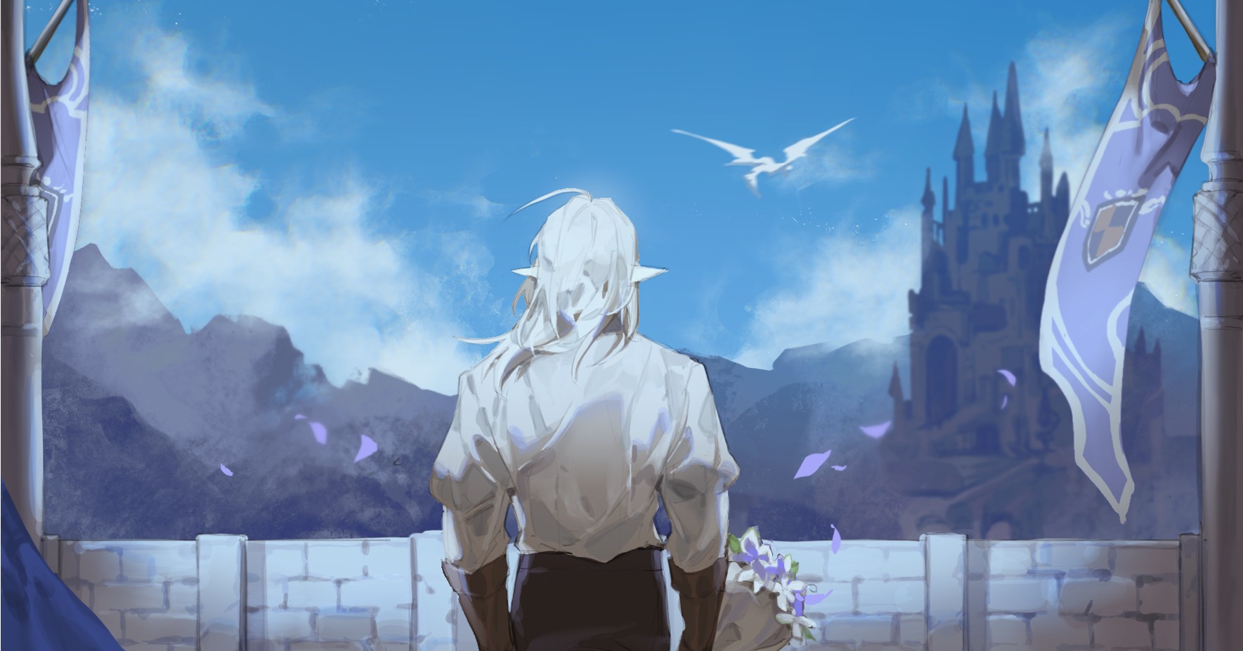 1boy bayinxie blue_sky bouquet castle cloud commentary_request dragon elezen elf estinien_varlineau falling_petals final_fantasy final_fantasy_xiv flag flower from_behind highres holding holding_bouquet long_hair male_focus mountain mountainous_horizon outdoors petals pointy_ears purple_flower sky solo white_hair