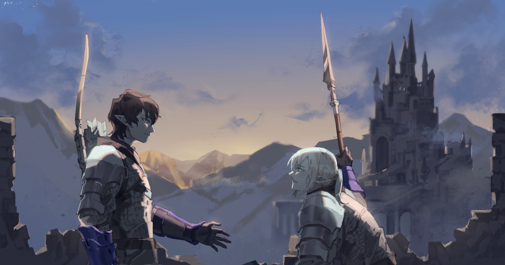 2boys armor arrow_(projectile) aymeric_de_borel bayinxie black_gloves black_hair bow_(weapon) castle commentary_request elezen elf estinien_varlineau final_fantasy final_fantasy_xiv gloves grey_hair highres lance male_focus mountain mountainous_horizon multiple_boys pointy_ears polearm ponytail short_hair smile weapon