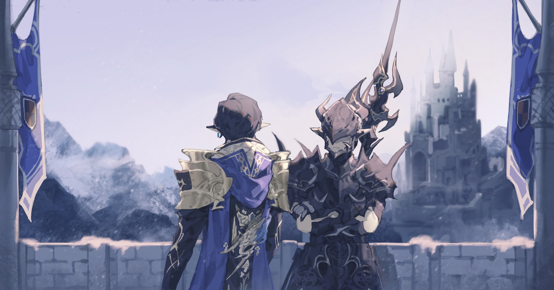 2boys armor aymeric_de_borel bayinxie black_hair blue_cape cape castle commentary_request crossed_arms dragoon_(final_fantasy) elezen elf epaulettes estinien_varlineau expressionless final_fantasy final_fantasy_xiv flag highres lance male_focus mountain multiple_boys outdoors pointy_ears polearm short_hair snow weapon weapon_on_back