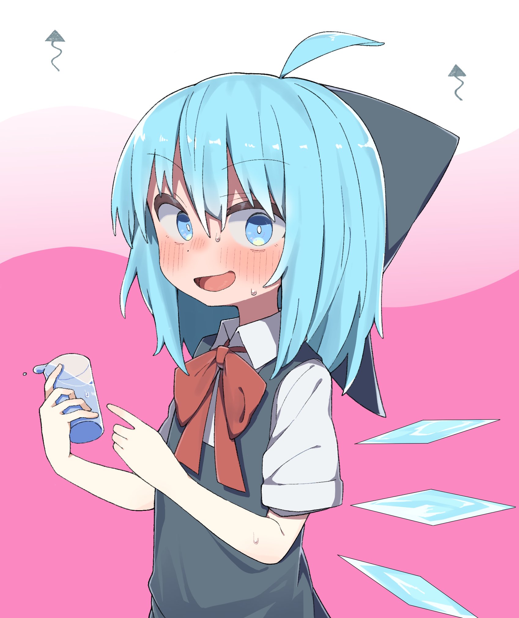 1girl ahoge arrow_(symbol) blue_eyes blue_hair blush bow bowtie bright_pupils cirno cup detached_wings drink drinking_glass female_focus hair_bow highres holding holding_cup hot kae_karee looking_at_viewer medium_hair open_mouth pink_background red_bow red_bowtie short_sleeves solo sweat touhou white_pupils wings
