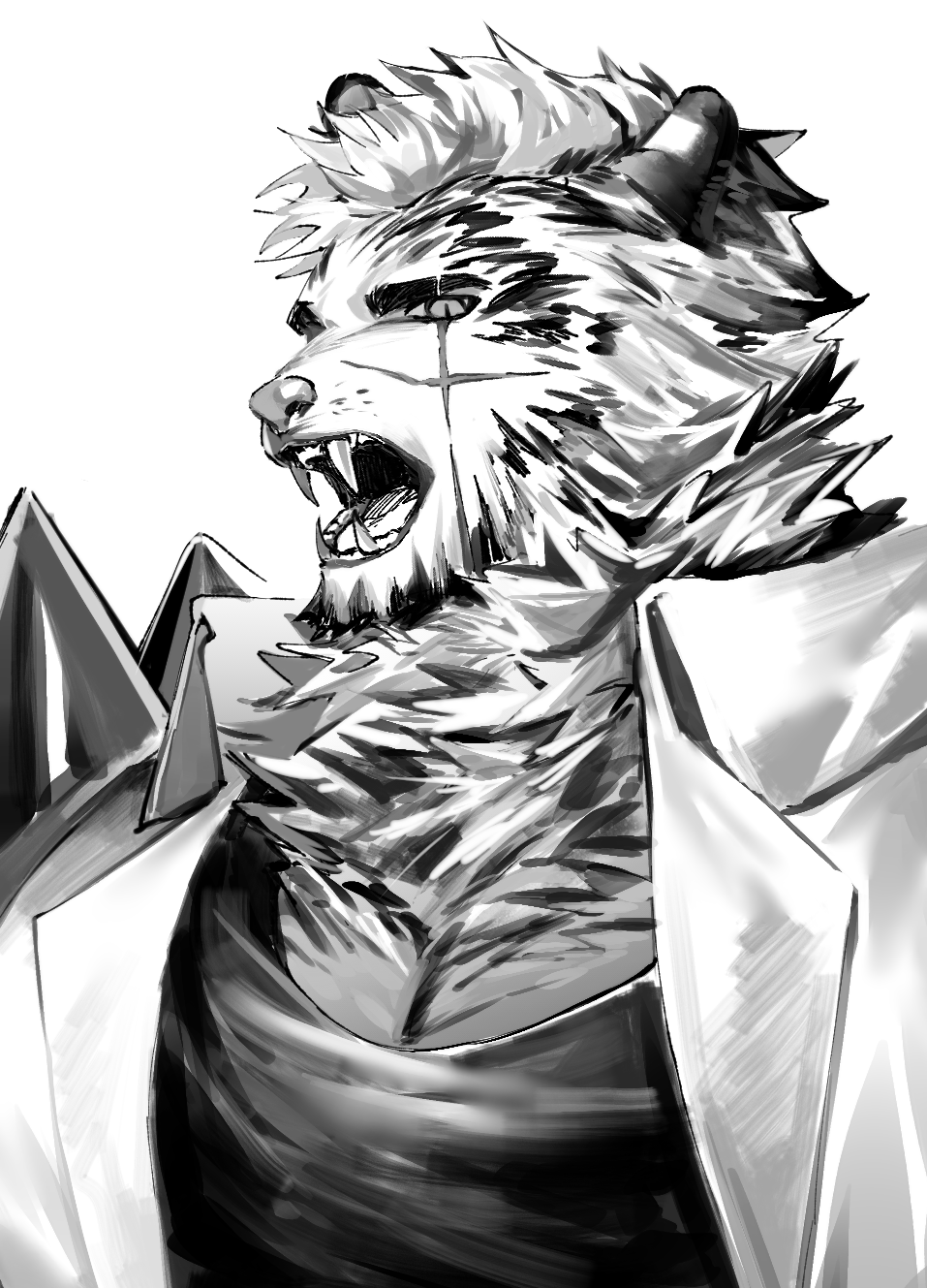 1boy animal_ears arknights facial_hair furry furry_male goatee greyscale highres male_focus monochrome mountain_(arknights) muscular muscular_male open_mouth pectoral_cleavage pectorals portrait rcc_(rcc_jd) scar scar_across_eye scar_on_face sharp_teeth short_hair solo teeth thick_eyebrows tiger_boy tiger_ears white_hair