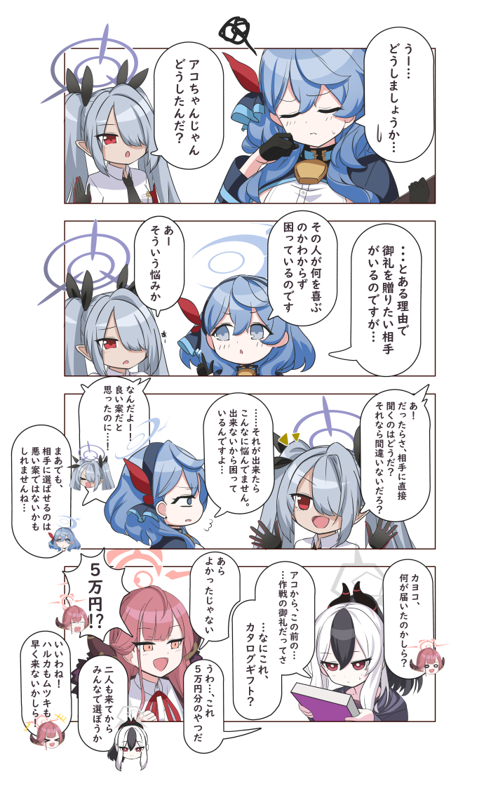 4girls 4koma ako_(blue_archive) armband aru_(blue_archive) bell belt_collar black_gloves black_hair black_necktie black_sweater blue_archive blue_eyes blue_hair blunt_bangs bow bowtie coat coat_on_shoulders collar comic commentary_request dark-skinned_female dark_skin demon_girl demon_horns earrings fur-trimmed_coat fur_trim gloves grey_hair hair_between_eyes hair_over_one_eye hair_ribbon hairband halo hood hooded_sweater horns iori_(blue_archive) jewelry kayoko_(blue_archive) long_hair long_sleeves looking_at_another multicolored_hair multiple_girls neck_bell necktie open_clothes open_coat pointy_ears ponytail red_bow red_bowtie red_eyes red_hair ribbon shooka sidelocks sweatdrop sweater thinking translation_request two-tone_hair white_hair yellow_eyes