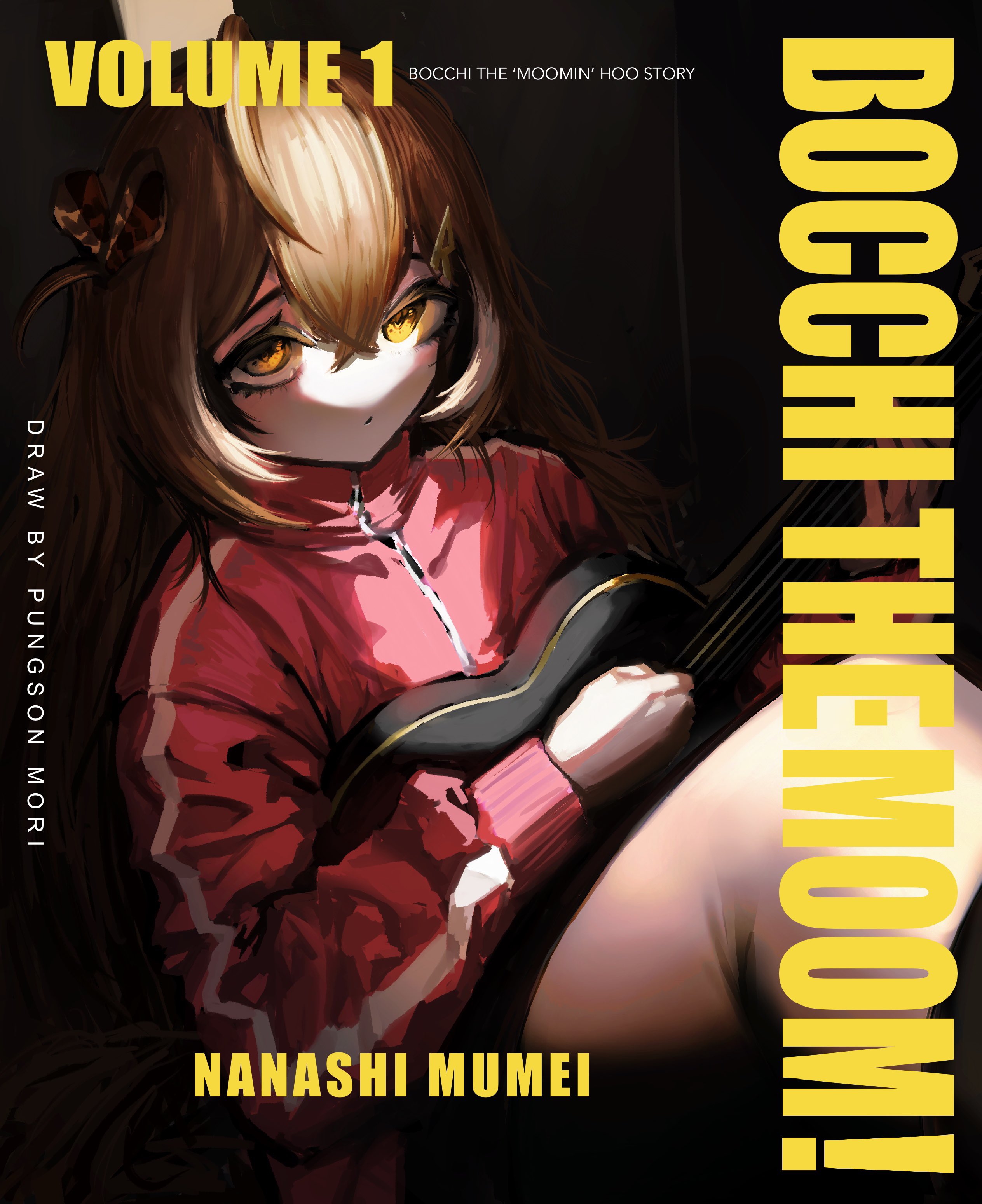 1girl absurdres ahoge artist_name bocchi_the_rock! brown_eyes brown_hair character_name copyright_name cosplay cover cover_page feather_hair_ornament feathers gotoh_hitori guitar hair_ornament hairclip high_contrast highres hitori_bocchi_(cosplay) holding holding_instrument hololive hololive_english instrument long_hair looking_at_viewer nanashi_mumei pink_track_suit pungson_mori side_ponytail track_suit very_long_hair virtual_youtuber
