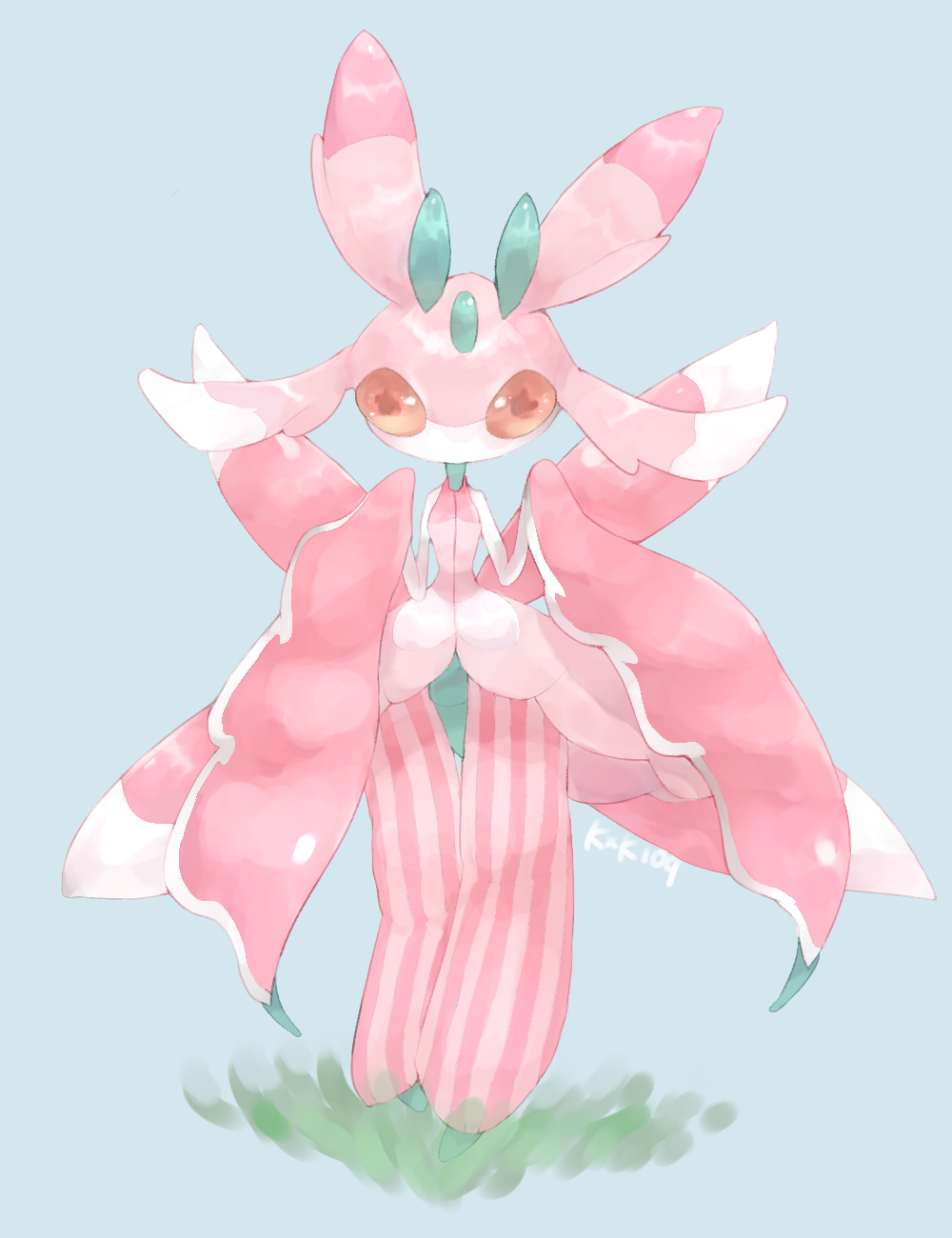 1girl antennae arthropod_girl artist_name blue_background colored_skin female_focus flat_chest full_body furry furry_female gen_7_pokemon grass green_skin hands_up highres legs looking_at_viewer lurantis multicolored_skin natsumekan nintendo no_mouth orange_eyes pink_skin pokemon pokemon_(creature) signature simple_background solo standing straight-on striped_skin white_skin