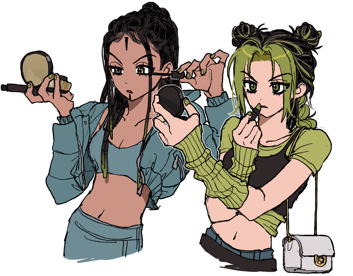 2girls alternate_hairstyle applying_makeup arm_warmers bag black_hair cosmetics crop_top cropped_legs double_bun dreadlocks ermes_costello eyeliner fu_r_y green_eyes green_hair green_lips green_nails grey_hair hair_bun handbag jojo_no_kimyou_na_bouken kuujou_jolyne lipstick lipstick_tube makeup makeup_brush midriff multicolored_hair multiple_girls navel stone_ocean strapless tube_top two-tone_hair