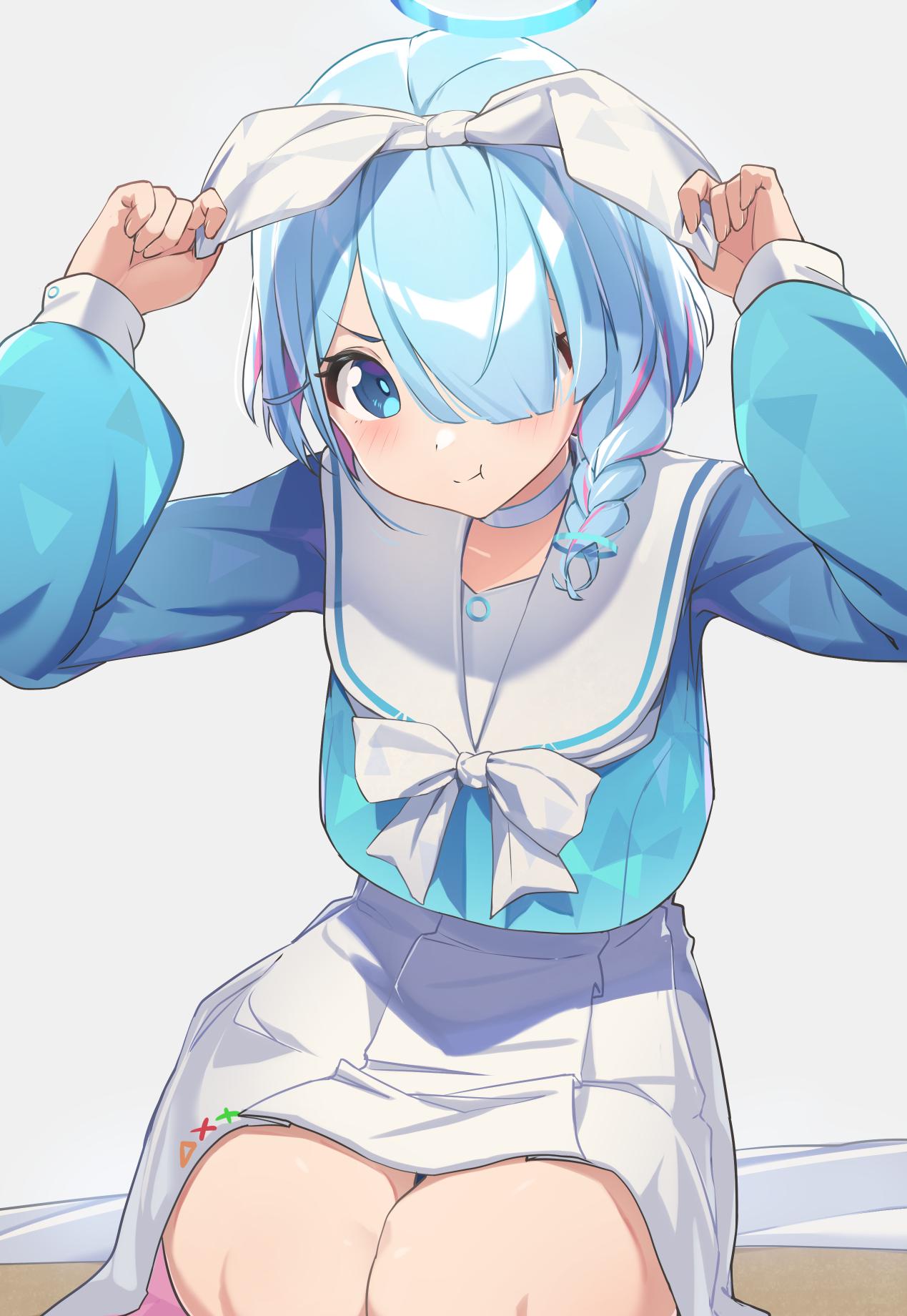 1girl :t arona_(blue_archive) blue_archive blue_eyes blue_hair braid choker closed_mouth commentary grey_background hairband highres looking_at_viewer multicolored_hair pink_hair pout reulem sailor_collar school_uniform short_hair simple_background single_braid sitting skirt two-tone_hair white_choker white_hairband white_sailor_collar white_skirt