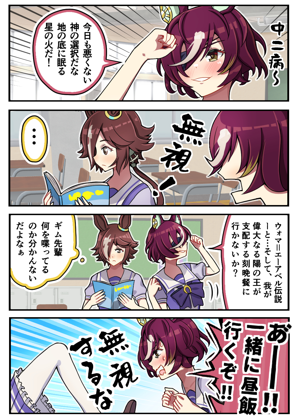 ... 2girls 4koma abebe animal_ears book bow bowtie brown_hair chalkboard chuunibyou classroom comic commentary ear_ornament emphasis_lines eyepatch grey_eyes hair_over_one_eye highres holding holding_book horse_ears horse_girl indoors light_brown_hair long_hair low_ponytail motion_lines multicolored_hair multiple_girls open_book outline pleated_skirt ponytail purple_bow purple_bowtie purple_shirt reading sailor_collar shirt shouting skirt sound_effects speech_bubble spoken_ellipsis streaked_hair tanino_gimlet_(umamusume) thought_bubble translation_request umamusume unconventional_sound_effect vodka_(umamusume) white_sailor_collar