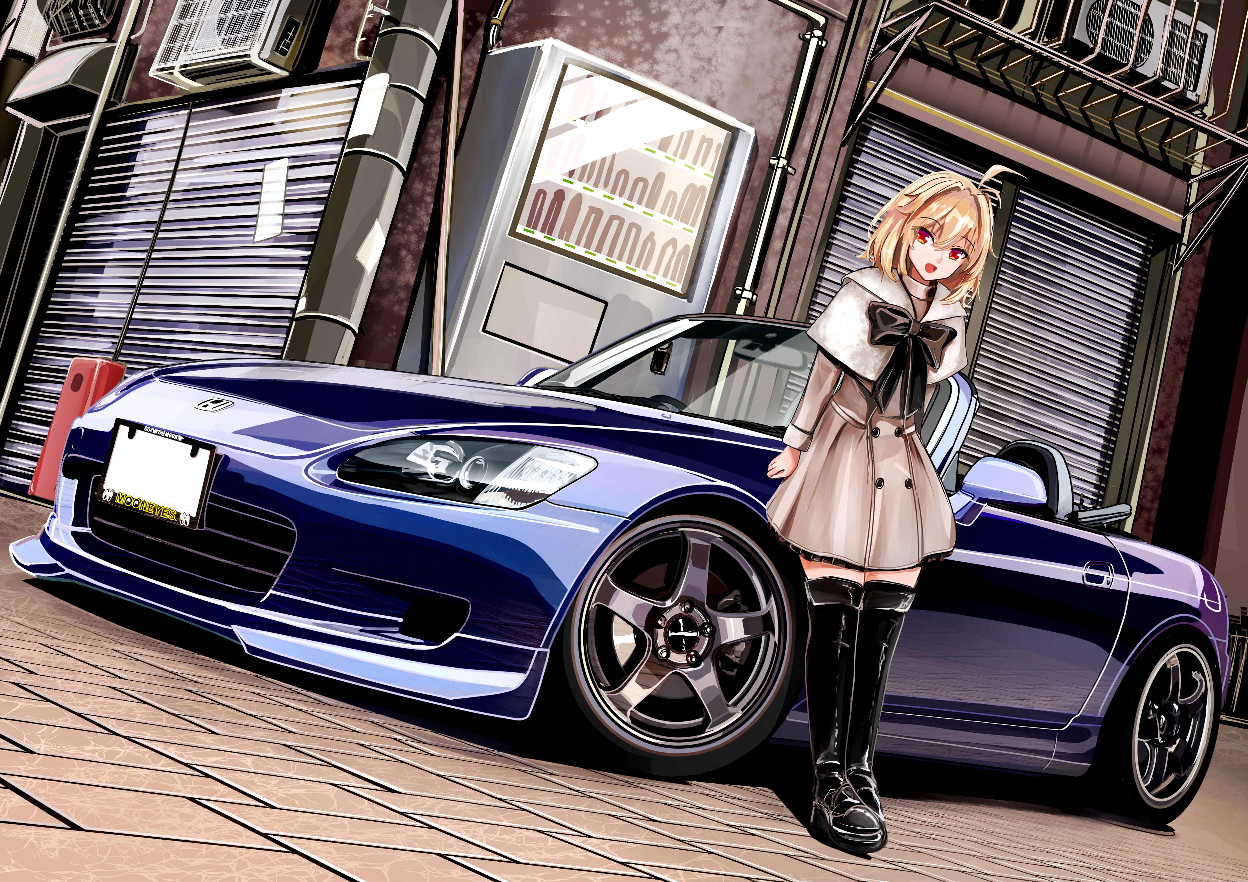 1girl 3books absurdres air_conditioner arcueid_brunestud black_boots black_bow blonde_hair boots bow brown_skirt capelet car commentary_request convertible cowlick grey_capelet head_tilt highres honda honda_s2000 medium_hair motor_vehicle open_mouth partial_commentary red_eyes skirt smile solo sports_car thigh_boots tsukihime vehicle_focus vending_machine
