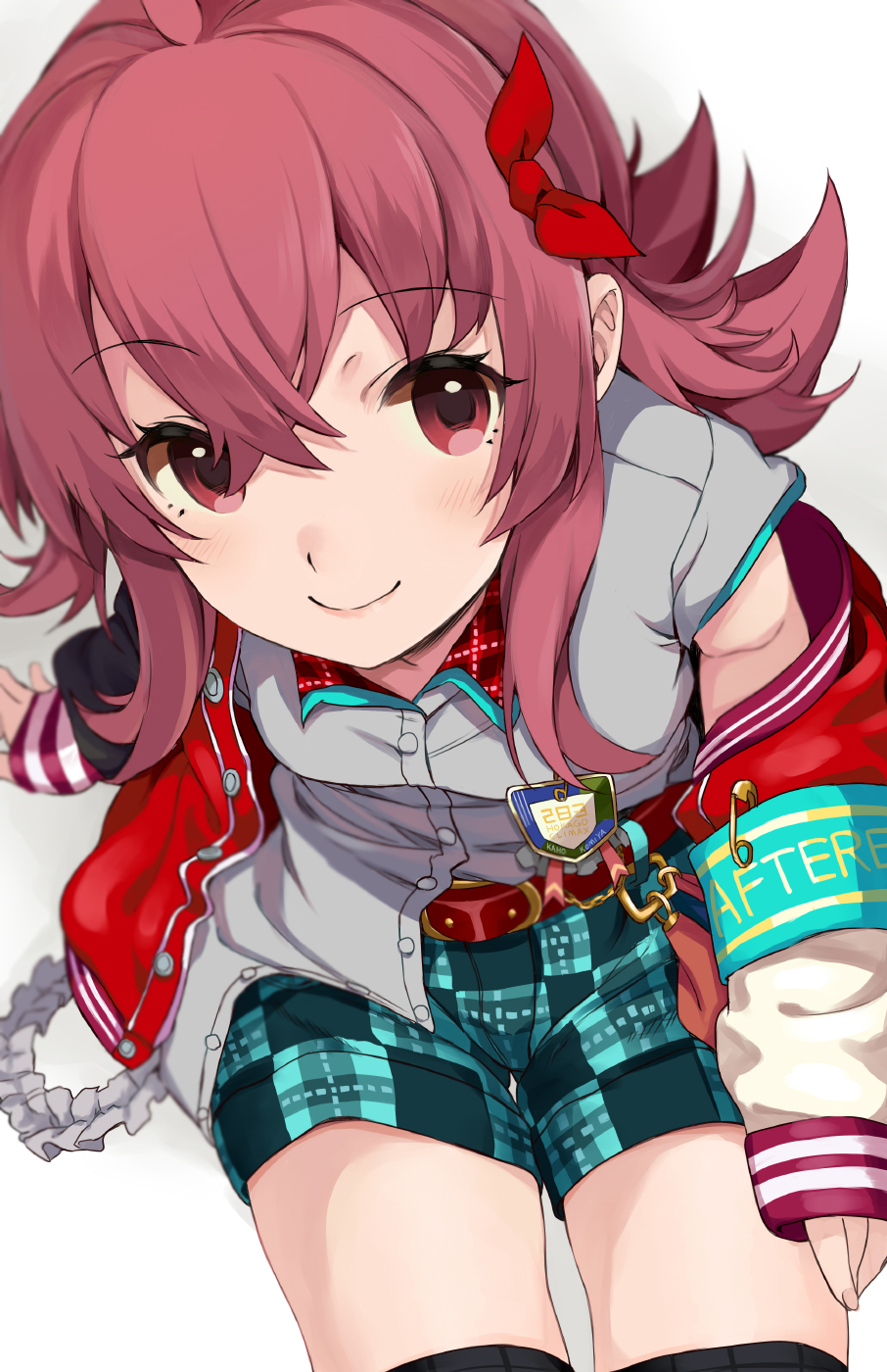 1girl ahoge arm_support armband belt black_socks blue_armband blue_shorts blush breasts checkered_clothes checkered_shorts closed_mouth from_above grey_shirt hair_between_eyes hair_ribbon highres idolmaster idolmaster_shiny_colors jacket kirarin369 komiya_kaho long_hair long_sleeves looking_at_viewer looking_up off_shoulder plaid_clothes plaid_shorts red_belt red_eyes red_hair red_jacket red_ribbon ribbon safety_pin shirt short_sleeves shorts simple_background sitting small_breasts smile socks solo white_background