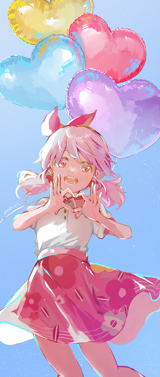 1girl backlighting balloon bare_legs bow buttons collared_shirt dot_nose feet_out_of_frame floral_print hair_bobbles hair_bow hair_ornament hands_up heart heart_balloon heart_hands highres kaname_madoka blue_background light_blush light_particles looking_at_viewer looking_down low_twintails mahou_shoujo_madoka_magica mahou_shoujo_madoka_magica_(anime) official_alternate_costume open_mouth own_hands_together pink_eyes pink_hair pink_skirt polo_shirt puffy_short_sleeves puffy_sleeves red_bow rekoku shirt shirt_tucked_in short_sleeves short_twintails sidelocks simple_background skirt smile solo tareme triple_horizontal_stripe twintails twitter_username white_shirt