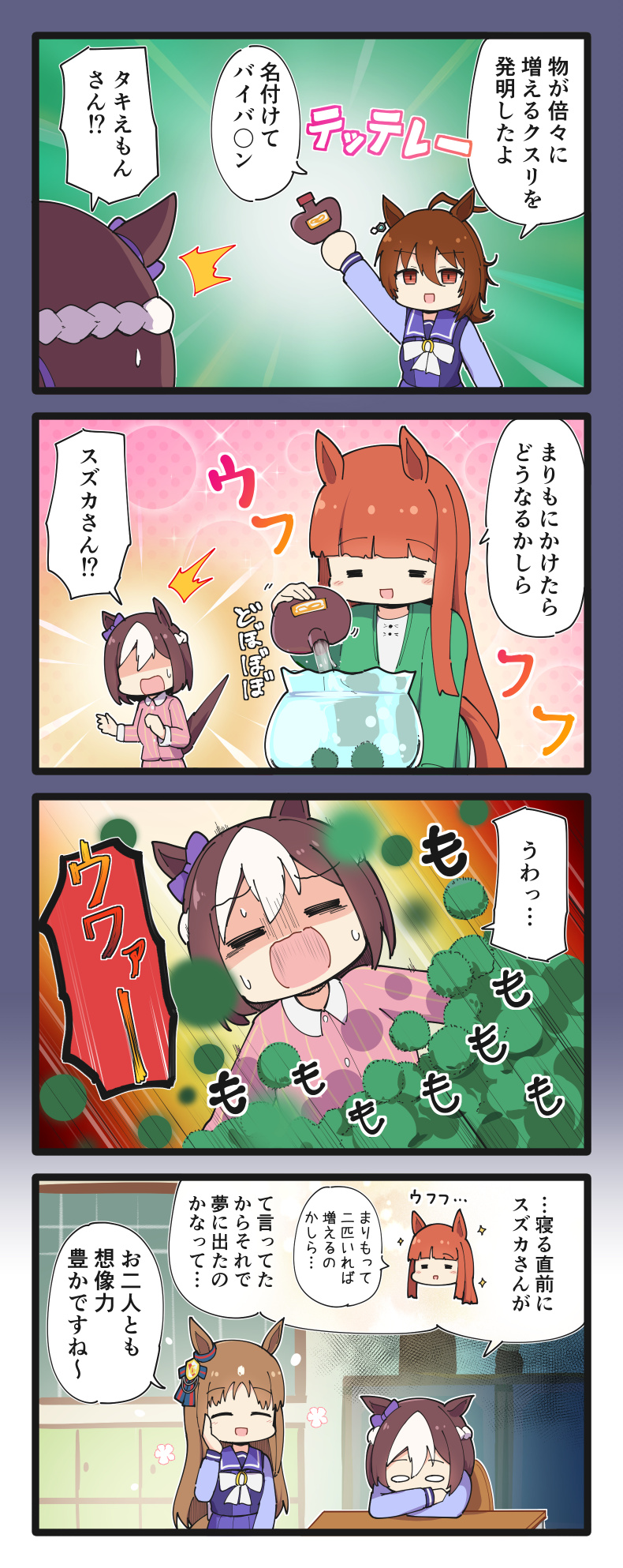 4girls 4koma =_= ^^^ agnes_tachyon_(umamusume) ahoge animal_ears blunt_bangs blush_stickers bow bowtie braid brown_eyes brown_hair chair chalkboard classroom comic commentary_request desk doraemon dreaming ear_bow earrings emphasis_lines french_braid grass_wonder_(umamusume) green_background grey_background hair_between_eyes hand_on_own_face highres hime_cut horse_ears horse_girl horse_tail indoors jewelry long_hair long_sleeves marimo medium_hair messy_hair multicolored_hair multiple_girls nekonetoru_take orange_hair outline pajamas parody pink_background pink_pajamas pleated_skirt pouring purple_bow purple_sailor_collar purple_shirt purple_skirt sailor_collar school_uniform shaded_face shirt short_hair sidelocks silence_suzuka_(umamusume) single_earring sitting skirt sound_effects special_week_(umamusume) speech_bubble stiff_tail striped_clothes striped_pajamas sweatdrop tail tail_raised tracen_school_uniform translation_request two-tone_hair umamusume unconventional_sound_effect white_bow white_bowtie white_hair wide_oval_eyes winter_uniform