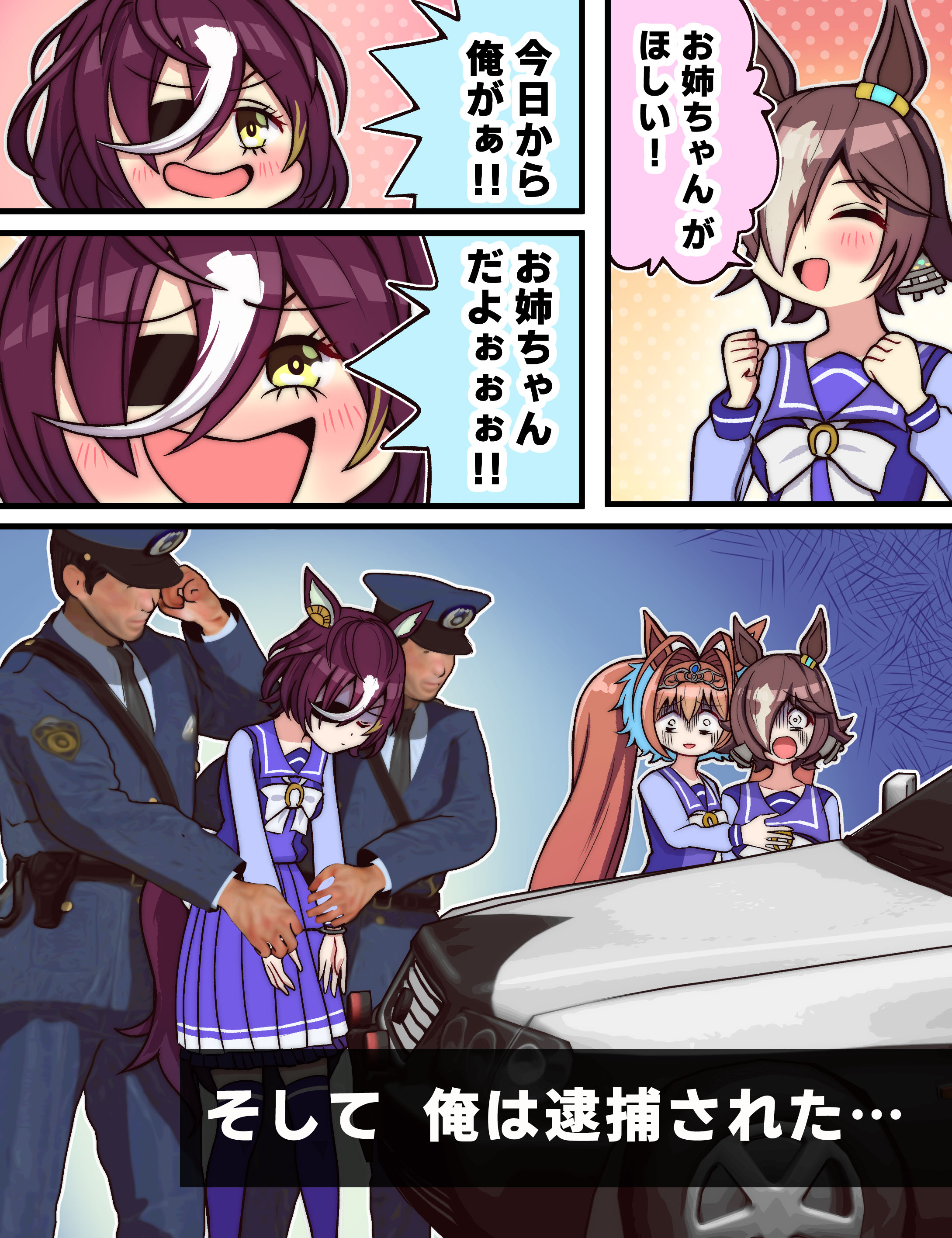 2boys 3girls ^_^ abebe absurdres animal_ears arrest blank_eyes brown_hair car closed_eyes comic commentary constricted_pupils cuffs daiwa_scarlet_(umamusume) eyepatch gloom_(expression) grey_hair hair_between_eyes hair_over_one_eye handcuffs hat height_difference highres horse_ears horse_girl horse_tail jacket japan_national_police long_hair long_sleeves looking_at_another medium_hair motor_vehicle multicolored_hair multiple_boys multiple_girls necktie open_mouth orange_hair pants police police_car police_hat police_uniform policeman red_hair shaded_face shirt skirt smile standing tail tanino_gimlet_(umamusume) translation_request turn_pale twintails umamusume very_long_hair vodka_(umamusume) white_hair yellow_eyes