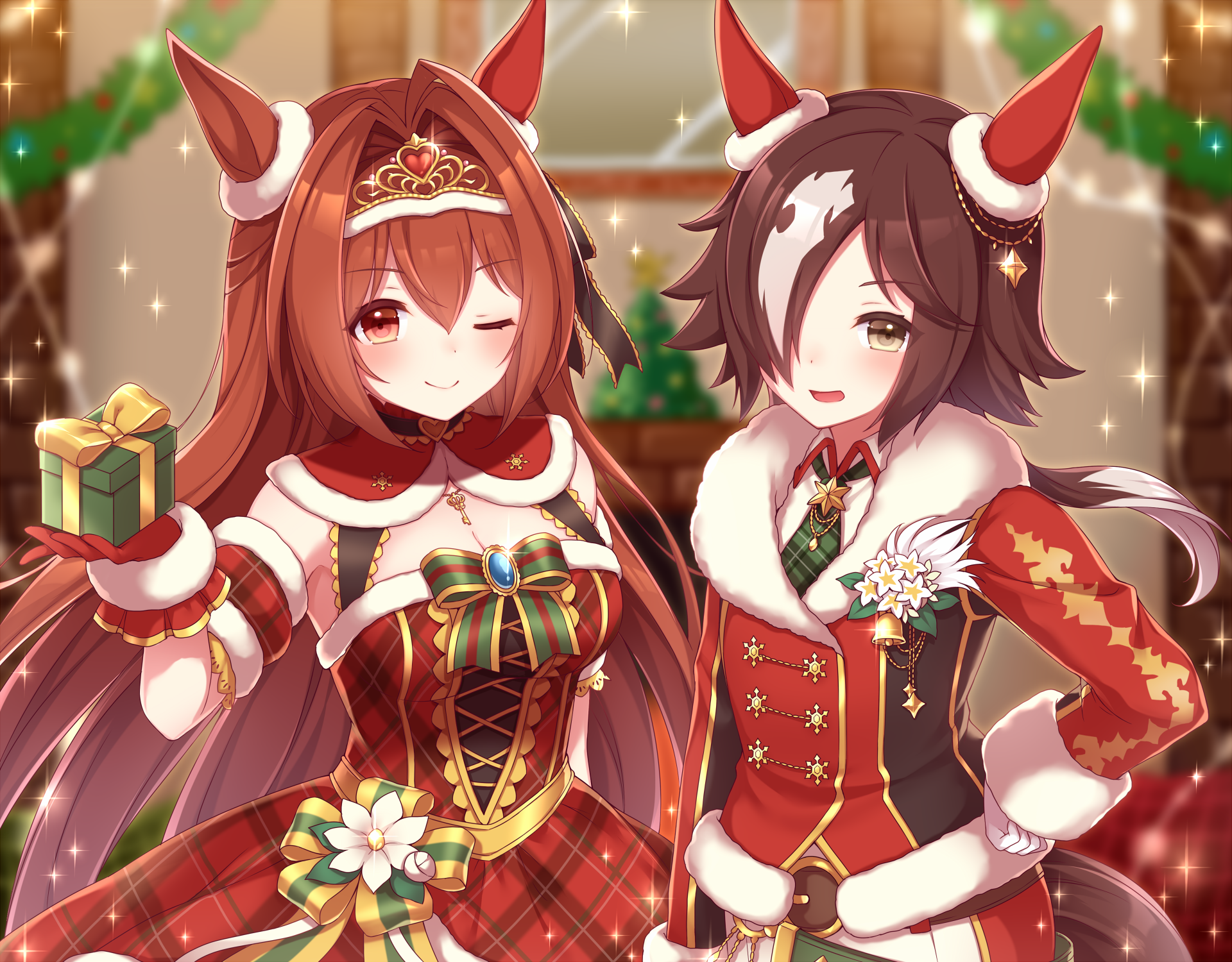 2girls alternate_costume alternate_hairstyle blurry blurry_background breasts brown_eyes brown_hair christmas christmas_tree cleavage commentary_request daiwa_scarlet_(scarlet_nuit_etoile)_(umamusume) daiwa_scarlet_(umamusume) gloves hair_over_one_eye highres horse_girl long_hair medium_breasts multiple_girls necktie one_eye_closed open_mouth sanotsuki santa_costume tiara umamusume vodka_(nonfreezing_aqua_vitae)_(umamusume) vodka_(umamusume)