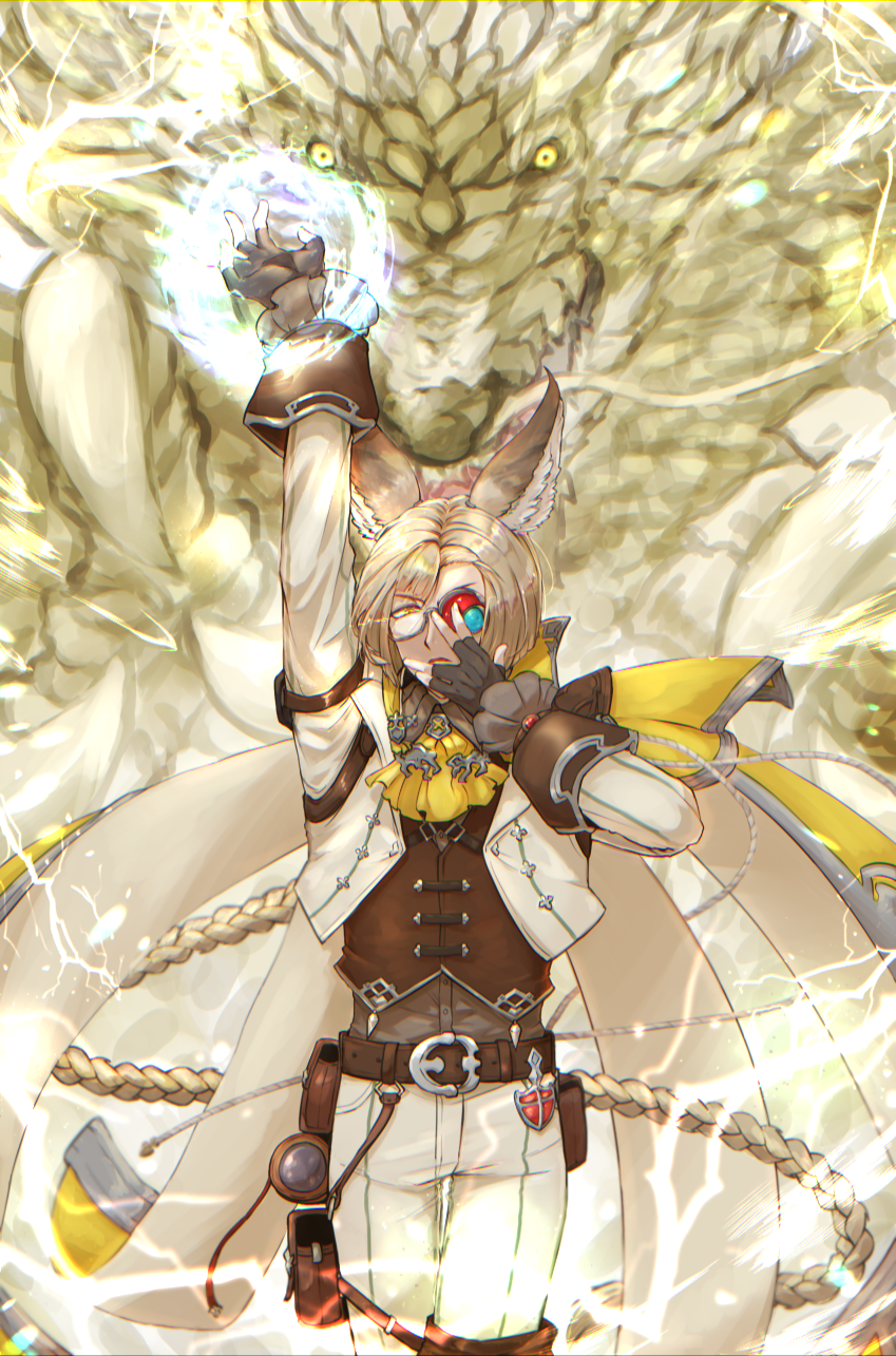 1boy adjusting_eyewear animal_ears arm_up ascot asymmetrical_bangs belt belt_pouch black_gloves blonde_hair blunt_bangs braid brown_belt brown_shirt brown_vest cape collared_shirt cowboy_shot cropped_jacket dragon dual_persona eastern_dragon electricity erune fingerless_gloves glasses gloves granblue_fantasy heterochromatic_eyewear highres hk_nh3cooh jacket long_hair looking_at_viewer lu_woh_(granblue_fantasy) magic male_focus open_clothes open_jacket pants parted_lips pouch shirt single_braid sleeve_cuffs sleeve_garter solo straight-on thigh_strap tinted_eyewear v-shaped_eyebrows very_long_hair vest white_cape white_jacket white_pants yellow_ascot yellow_eyes