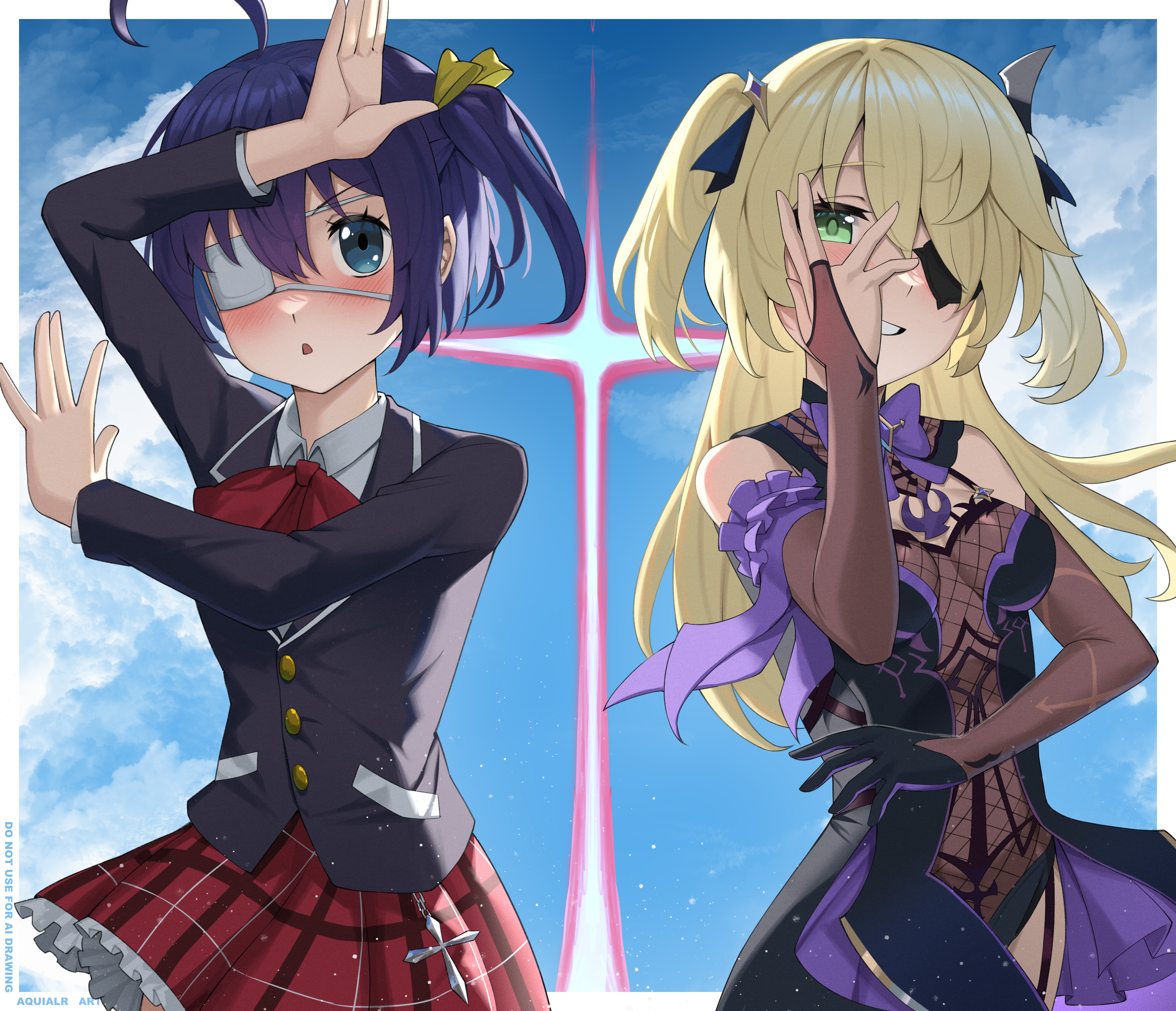 1girl absurdres ahoge aquilar bare_shoulders bat_ornament black_ribbon blazer blonde_hair blue_eyes blue_hair blush bodystocking bow bowtie breasts chuunibyou chuunibyou_demo_koi_ga_shitai! collar dress eyepatch fischl_(genshin_impact) fishnet_bodystocking fishnets genshin_impact gloves green_eyes hair_over_one_eye hair_ribbon highres icho_private_high_school_uniform jacket leotard long_hair looking_at_viewer medical_eyepatch medium_breasts one_side_up open_mouth plaid_clothes plaid_skirt purple_bow purple_bowtie purple_ribbon ribbon school_uniform short_hair single_sleeve skirt smile tailcoat takanashi_rikka two_side_up uchida_maaya voice_actor_connection