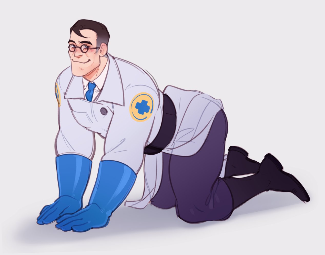 1boy all_fours alternate_body_type bara blu_medic_(tf2) blue_gloves commentary draw_your_babygirl_(meme) full_body glasses gloves long_sleeves looking_at_viewer male_focus medic_(tf2) meme military military_uniform muscular muscular_male necktie pants pectorals sho_guru short_hair sideburns solo team_fortress_2 thick_thighs thighs untranslatable_commentary white_background