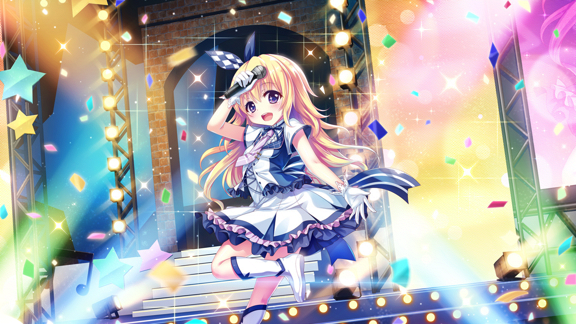 1girl arch arm_up back_bow blonde_hair blue_bow blue_dress boots bow breasts brick buttons checkered_bow checkered_clothes colored_lights concert confetti cross-laced_clothes dress film_grain frilled_dress frilled_skirt frills game_cg gloves hair_bow hasegawa_mii holding holding_microphone idol idol_clothes izumi_tsubasu long_hair microphone musical_note necktie non-web_source official_art open_mouth purple_eyes purple_necktie re:stage! screen self-datamine short_dress short_sleeves skirt small_breasts smile solo sparkle stage stage_lights stairs standing standing_on_one_leg star_(symbol) striped_bow teeth upper_teeth_only white_boots white_bow white_dress white_gloves white_skirt