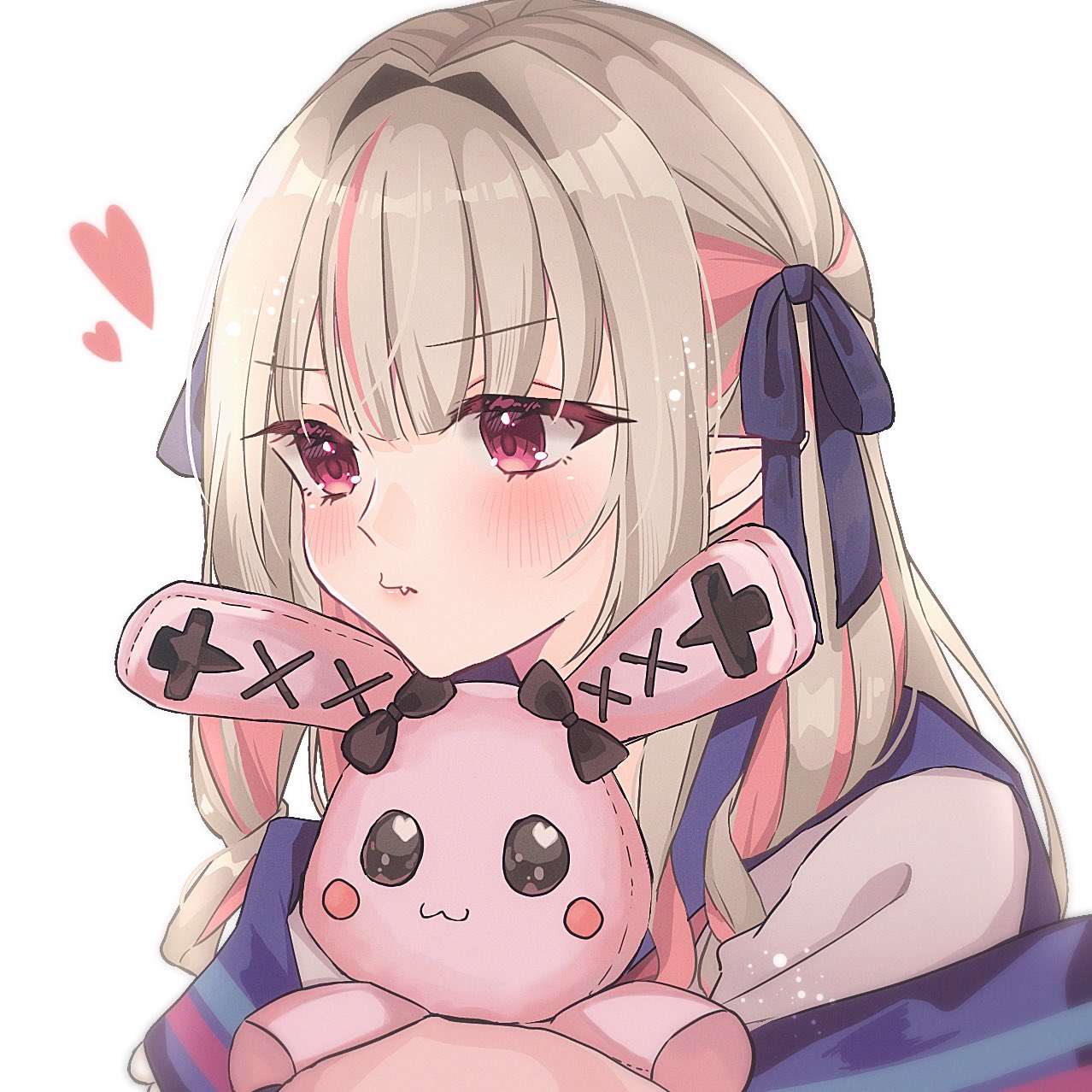 1girl black_ribbon blonde_hair blush commentary fang hair_intakes hair_ribbon heart highres long_hair makaino_ririmu makaino_ririmu_(4th_costume) multicolored_hair nijisanji pink_eyes pink_hair pointy_ears pout ribbon shiratamamaru solo streaked_hair stuffed_animal stuffed_rabbit stuffed_toy untranslatable_commentary virtual_youtuber