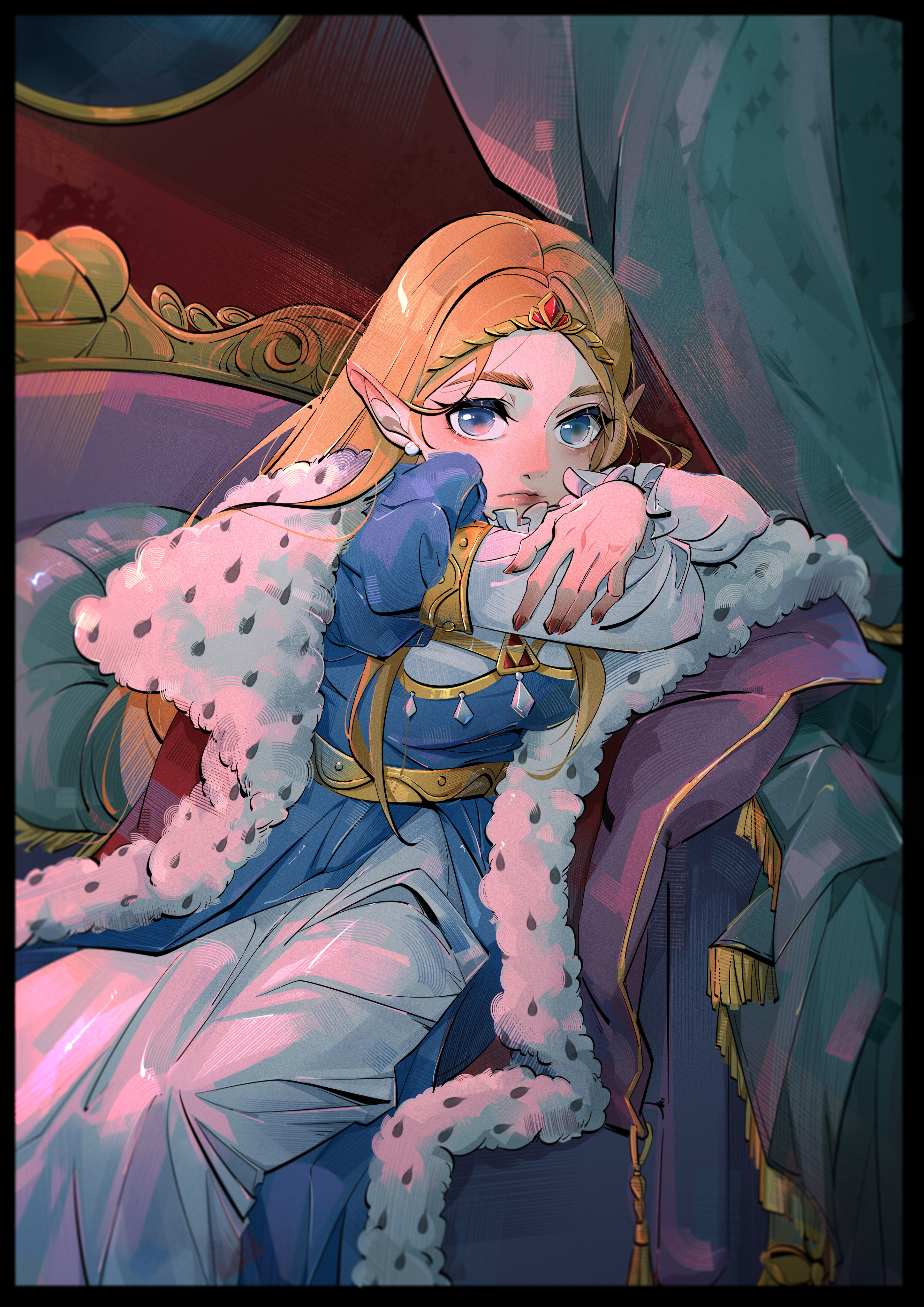 absurdres blonde_hair blue_dress blue_eyes circlet dress earrings highres jewelry long_hair long_sleeves looking_at_viewer momoju163 nintendo pointy_ears princess_zelda princess_zelda royal_robe sitting the_legend_of_zelda the_legend_of_zelda:_breath_of_the_wild