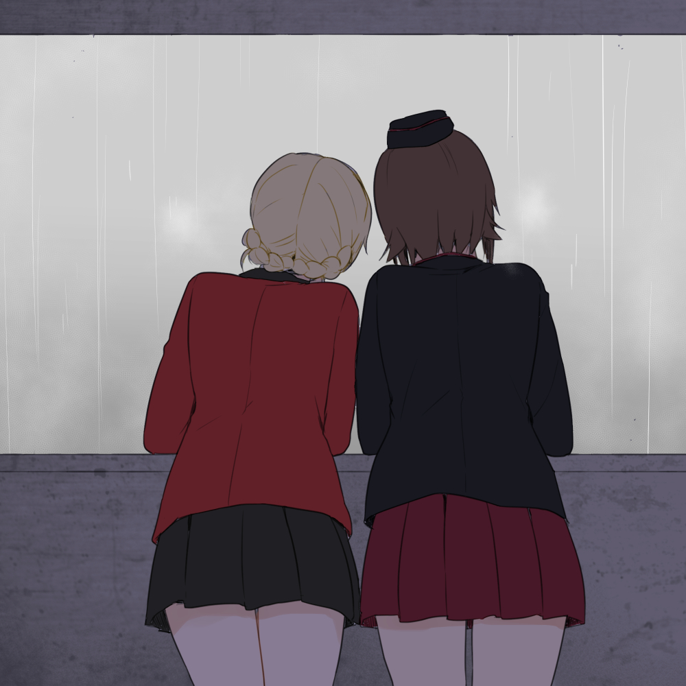 2girls black_headwear black_jacket black_skirt blonde_hair braid breath brown_hair commentary darjeeling_(girls_und_panzer) facing_away from_behind garrison_cap girls_und_panzer hat jacket kuromorimine_military_uniform leaning_to_the_side long_sleeves military military_hat military_uniform miniskirt multiple_girls nishizumi_maho pleated_skirt rain red_jacket red_skirt short_hair skirt st._gloriana's_military_uniform standing twin_braids yuuhi_(arcadia)