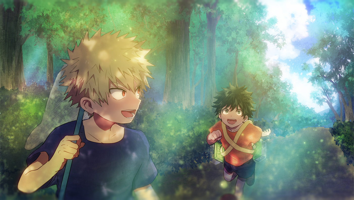 0ida 2boys :d aged_down bakugou_katsuki black_shorts blonde_hair bloom blue_shirt blue_sky blurry boku_no_hero_academia box bush butterfly_net child clenched_hand cloud cloudy_sky collarbone commentary container dappled_sunlight day foliage forest freckles green_eyes green_hair hair_between_eyes hand_net hand_up hands_up happy holding holding_butterfly_net light looking_at_another looking_back male_focus midoriya_izuku multiple_boys nature open_mouth orange_shirt pac-man_eyes red_eyes road running sanpaku shirt short_hair short_sleeves shorts shoulder_strap sky smile spiked_hair sunlight tree turning_head upper_body v-shaped_eyebrows vanishing_point