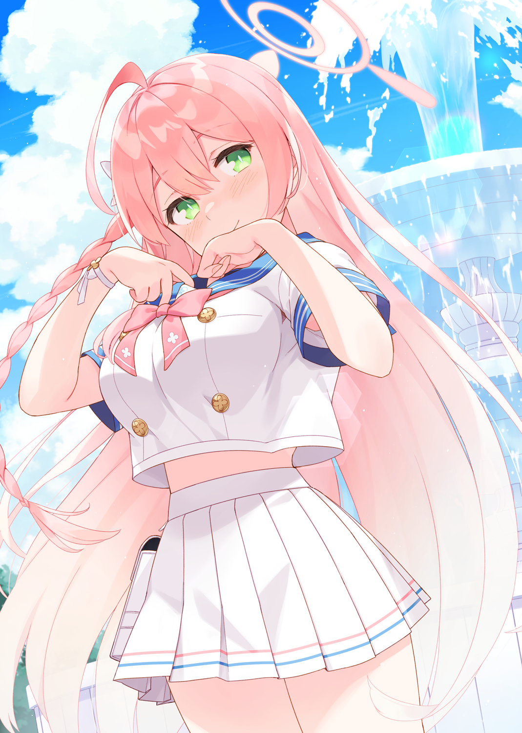 1girl ahoge blue_archive blue_sky blush bow bracelet braid cloud cloudy_sky commentary_request fountain from_below green_eyes hair_between_eyes hair_bow hair_ribbon halo hanako_(blue_archive) highres holster jewelry kano_hito long_hair looking_at_viewer looking_down midriff pink_hair pleated_skirt ribbon school_uniform serafuku short_sleeves sidelocks single_braid skirt sky solo white_skirt