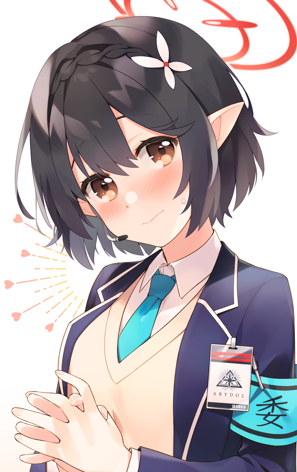 1girl 3: armband ayane_(blue_archive) black_hair blazer blue_archive braid brown_eyes collared_shirt commentary_request crown_braid hair_between_eyes hair_ornament halo head_tilt headset highres id_card jacket kano_hito long_sleeves looking_at_viewer no_eyewear pointy_ears school_uniform shirt short_hair sidelocks simple_background single_braid solo sweatdrop sweater_under_jacket white_background
