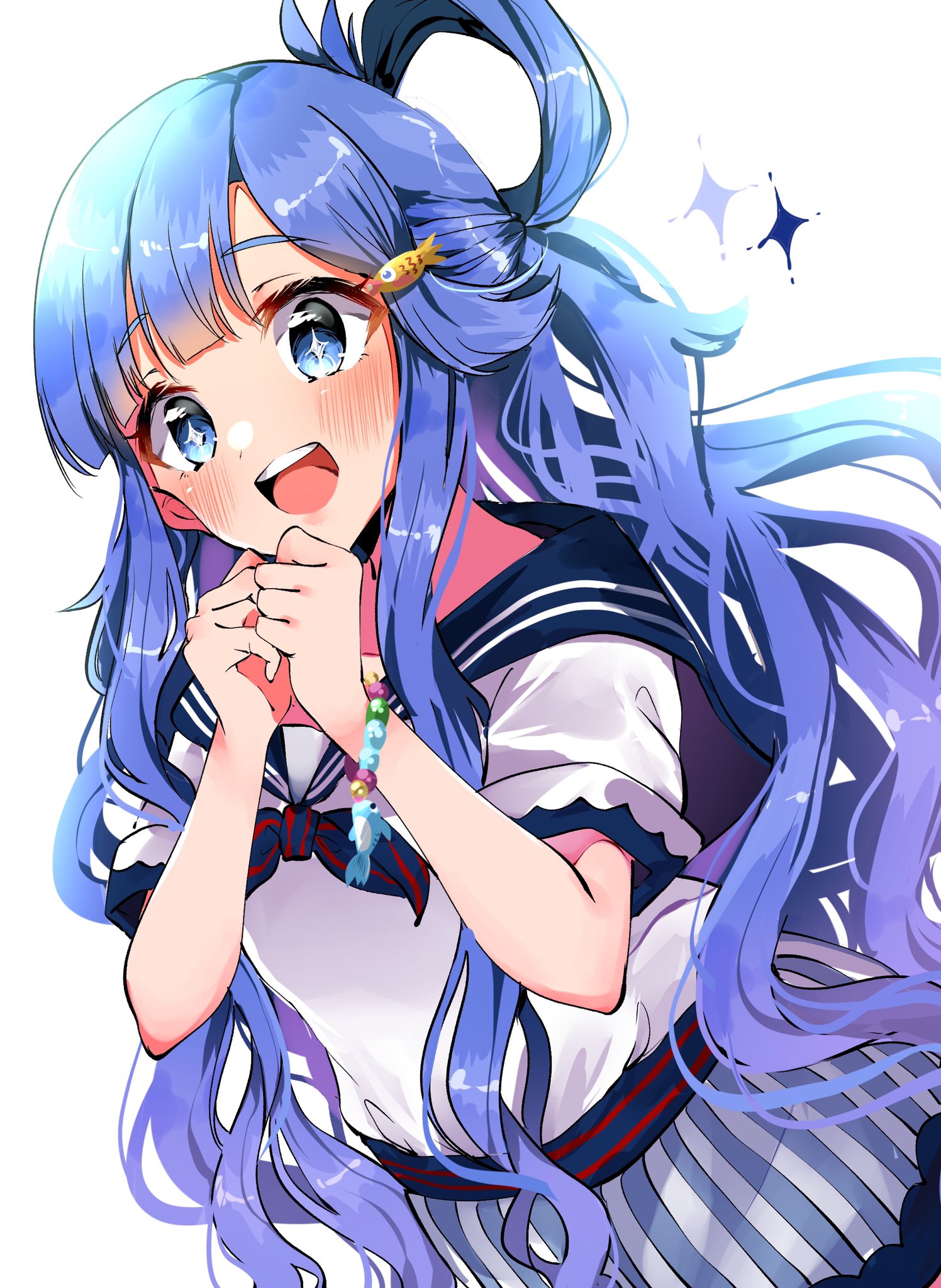 +_+ 1girl :d asari_nanami blue_eyes blue_hair blue_ribbon blue_sailor_collar blue_skirt blush bracelet fish_hair_ornament hair_ornament hair_rings highres idolmaster idolmaster_cinderella_girls idolmaster_cinderella_girls_starlight_stage jewelry long_hair looking_at_another neck_ribbon open_mouth ribbon sailor_collar shirt short_sleeves simple_background skirt smile solo striped_clothes striped_skirt teeth vertical-striped_clothes vertical-striped_skirt very_long_hair white_background white_shirt yuanagae